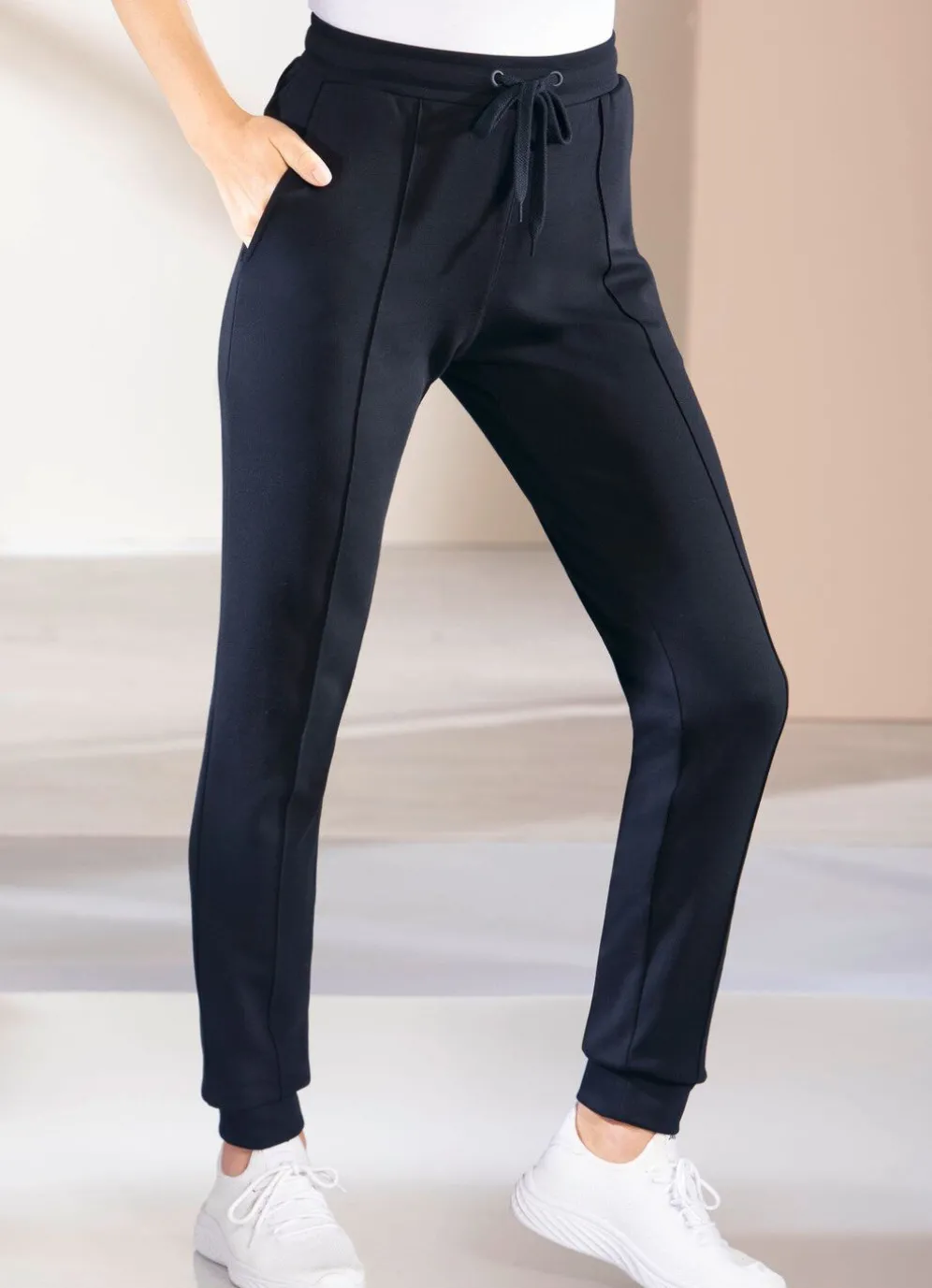 Komfortable Freizeithose mit Durchzugsband und Stopper im Dehnbund, Seitentaschen, Biesennaht sowie elastischen Beinabschlüssen.