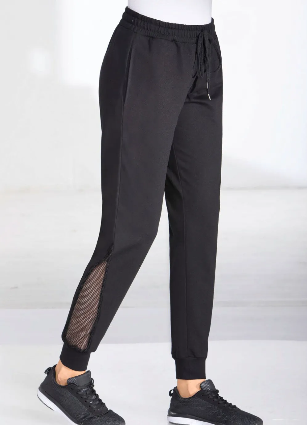 Schicke Damen-Freizeithose: Dehnbund mit Durchzugsband und Stopper, Seitentaschen, seitlichem Netzeinsatz sowie elastischen Beinabschlüssen.