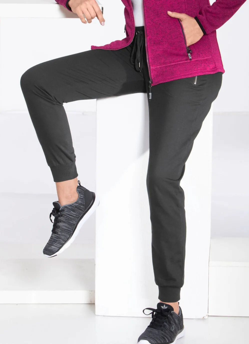 Sportive Freizeithose: Dehnbund mit Kordelzug, zwei Reißverschluss-Taschen sowie elastische Beinabschlüsse.