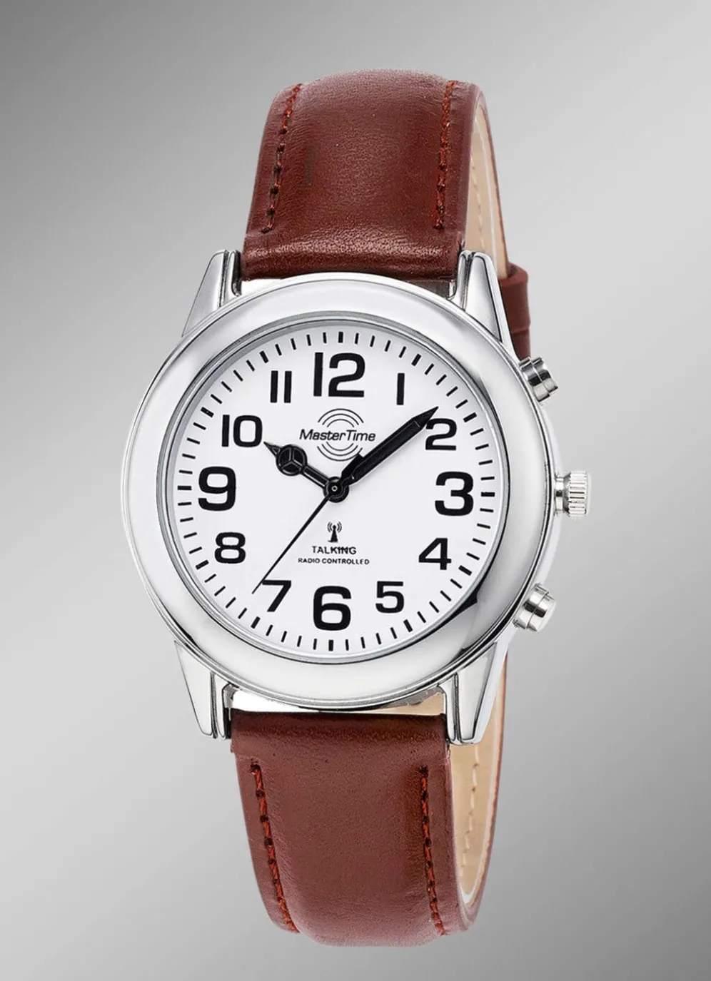Funk-Herrenuhr mit Lederband und sprechender Zeitansage