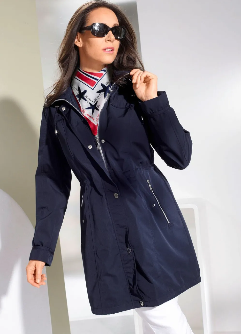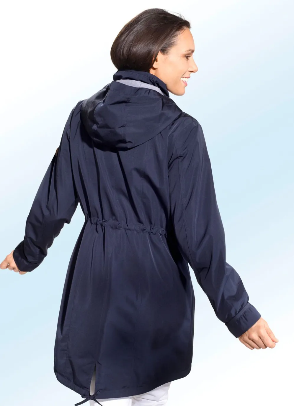 Fabelhafter Funktions-Kurzmantel mit Durchzugsband und Stopper in der Kapuze und in der Taille, durch Reißverschluss unter der Druckerleiste hoch schließbarem Steh-Umlegekragen, Reißverschlusstaschen und Zierösen, Umschlagärmeln, einer Innentasche sowie Durchzugsband im leicht verlängerten, abgerundeten Rückteil mit kleinem Schlitz. Länge ca. 90 cm.