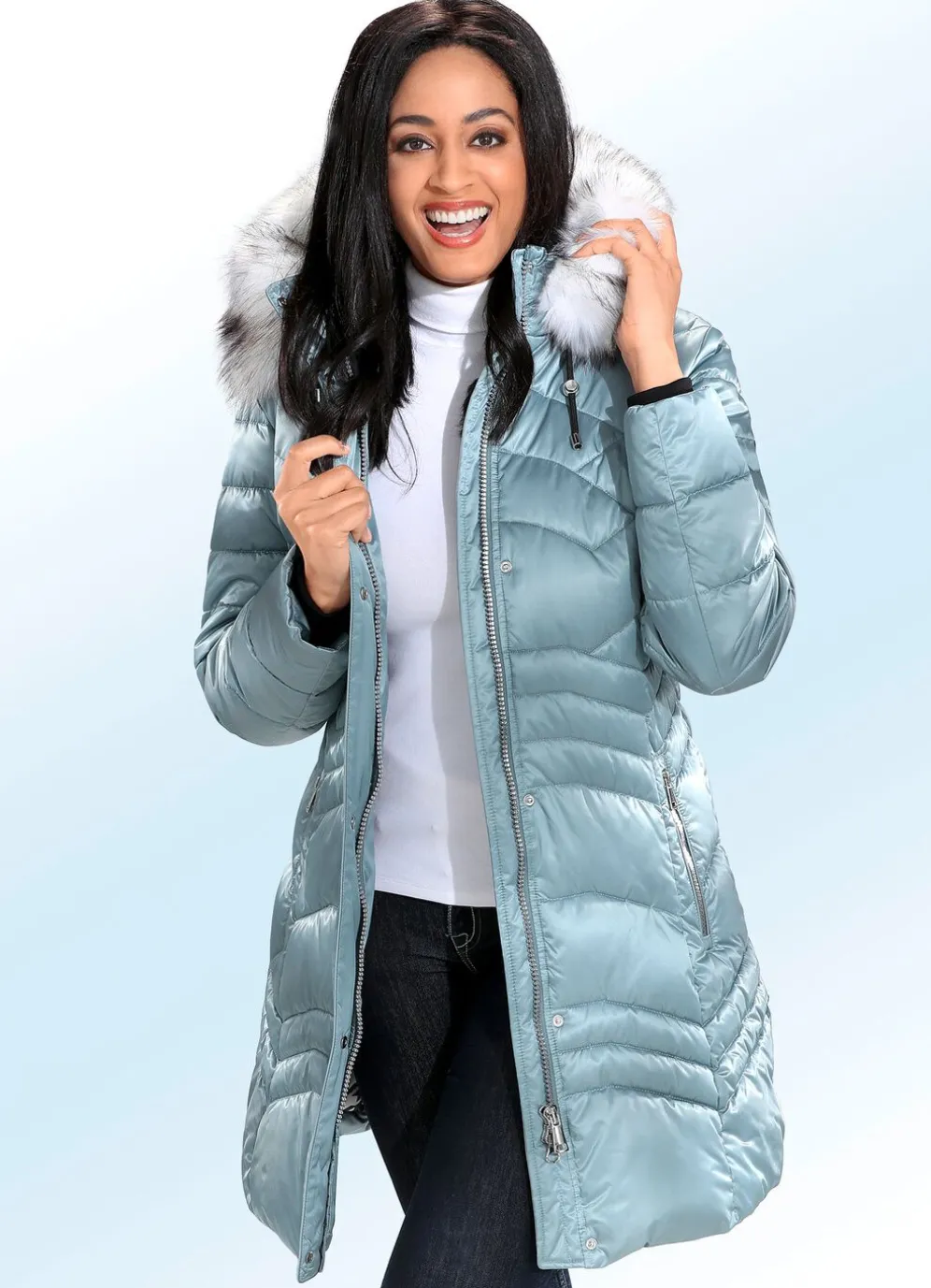 Mit modischem Chic zeigt sich dieser traumhafte Funktions-Kurzmantel: abnehmbare Kapuze mit Durchzugsband, Stopper und abnehmbarem Kunstpelz-Besatz, durch 2-Wege-Reißverschluss unter der Druckerleiste hoch schließbarer Stehkragen, Reißverschlusstaschen sowie eine Innentasche. Länge ca. 88 cm.
