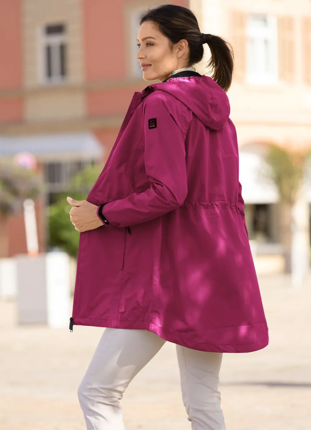 Funktions-Kurzmantel mit Durchzugsband, Stopper, kleinem Regenschild und Mesh-Innenausstattung mit Raubtierfell-Dessin in der festen Kapuze, durch 2-Wege-Reißverschluss hoch schließbarem Stehkragen, verdeckten Reißverschlusstaschen, Durchzugsband und Stopper in der Taille, weitenregulierbarem Riegel mit Klett an den Ärmelabschlüssen sowie verlängertem, abgerundetem Rückteil. Länge ca. 90cm, ab Gr. 44 ca. 93 cm, ab Gr. 46 ca. 96 cm,