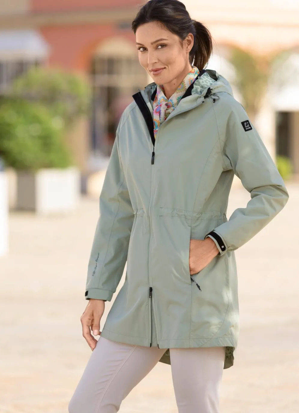 Funktions-Kurzmantel mit Durchzugsband, Stopper, kleinem Regenschild und Mesh-Innenausstattung mit Raubtierfell-Dessin in der festen Kapuze, durch 2-Wege-Reißverschluss hoch schließbarem Stehkragen, verdeckten Reißverschlusstaschen, Durchzugsband und Stopper in der Taille, weitenregulierbarem Riegel mit Klett an den Ärmelabschlüssen sowie verlängertem, abgerundetem Rückteil. Länge ca. 90cm, ab Gr. 44 ca. 93 cm, ab Gr. 46 ca. 96 cm,
