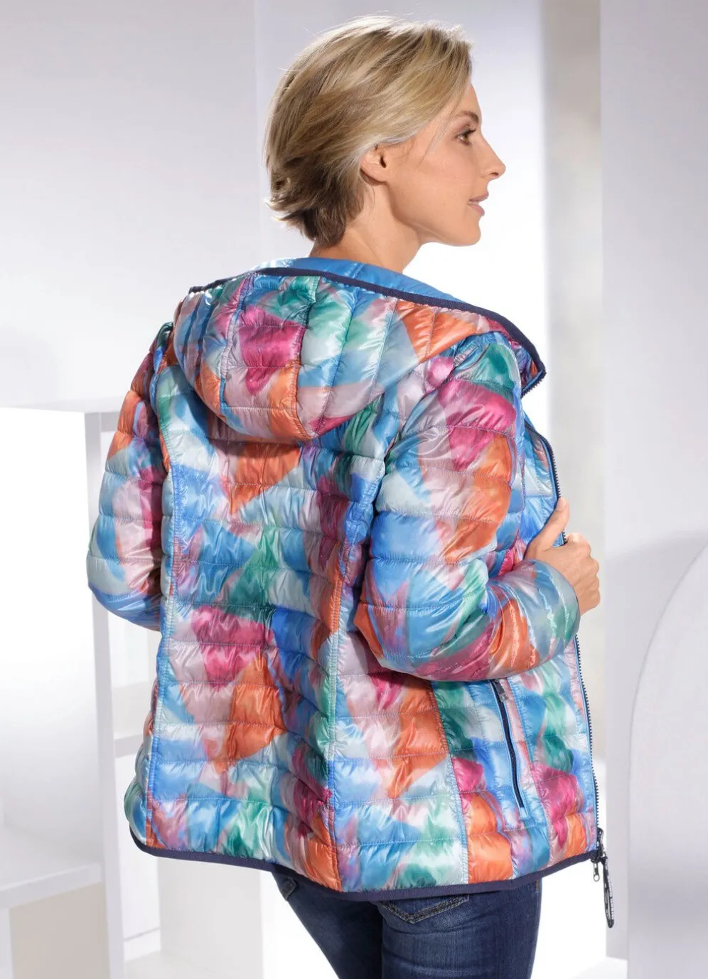 Ganz egal wie man sie dreht und wendet, diese Funktions-Wendejacke zeigt sich garantiert von ihrer Schokoladenseite: Kapuze mit kontrastfarbenem Elastikbändchen am Rand, an den Ärmelabschlüssen und am Saum, 2-Wege-Reißverschluss sowie Reißverschlusstaschen Eine Seite mit farbbrillantem Inkjet-Druck und Fantasiedessin in Pink-Orange-Bleu-Grün, die andere Seite in Azurblau uni. Länge ca. 64 cm, ab Gr. 40 ca. 66 cm, ab Gr. 44 ca. 68 cm, ab Gr. 48 ca. 70 cm, bei Gr. 52 ca. 72 cm.