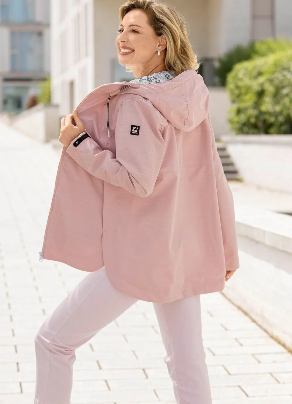 Funktionsjacke mit Durchzugsband an der festen Kapuze, durch Reißverschluss hoch schließbarem Stehkragen, verdeckten Reißverschlusstaschen, durch Riegel und Klett weitenregulierbaren Ärmelabschlüssen sowie leicht verlängertem, abgerundetem Rückteil. Länge ca. 76 cm, ab Gr. 42 ca. 79 cm, ab Gr. 46 ca. 82 cm.