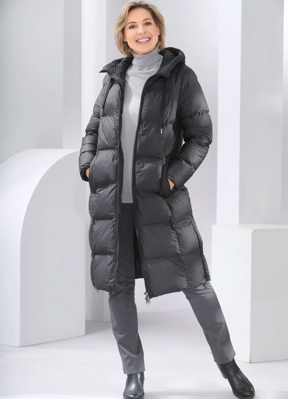 Schicker, schwarzer Funktionsmantel mit Kassettenstepp: feste Kapuze mit Bindeband, durch 2-Wege- Reißverschluss hoch schließbarer Stehkragen, Schubtaschen mit Blende, Reißverschluss an den Seitenschlitzen, Windfangärmeln aus Rippenstrick, einer Innentasche. Länge ca. 104 cm.