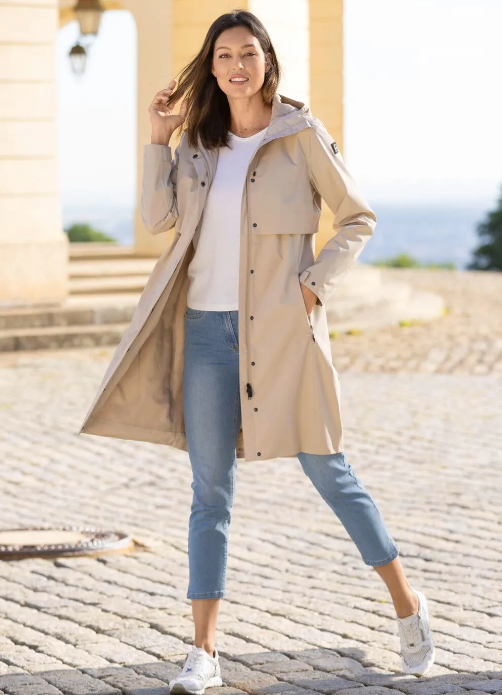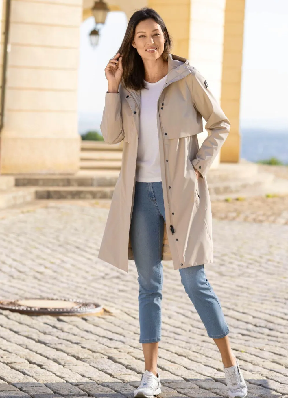 Funktionsmantel in Sand, mit Durchzugsband an der festen Kapuze, durch 2-Wege-Reißverschluss unter der verdeckten Druckerleiste hoch schließbarem Stehkragen, Vorderteilkoller, verdeckten Naht-Reißverschlusstaschen, durch Riegel mit Druckern weitenregulierbaren Ärmelabschlüssen, einer Innentasche sowie Koller mit Belüftung und kleinem Gehschlitz im Rückteil. Länge ca. 99 cm, ab Gr. 40 ca. 101 cm, ab Gr. 44 ca. 103 cm, ab Gr. 48 ca. 105 cm.