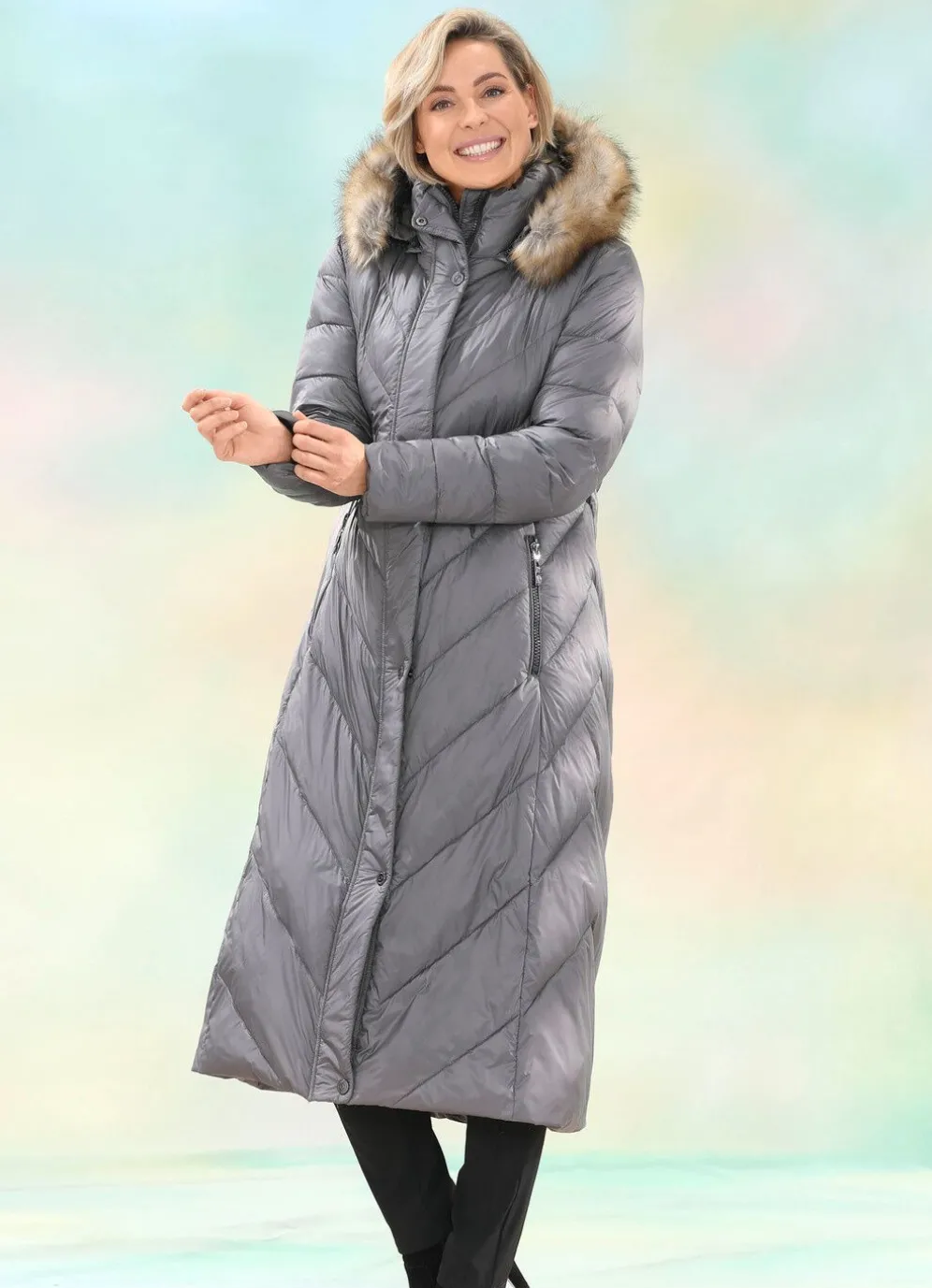 Attraktiver, schieferfarbener Funktionsmantel: abnehmbare Kapuze mit Durchzugsband, Stopper und abnehmbarem Kunstpelz-Besatz, durch 2-Wege-Reißverschluss unter der Druckerleiste hoch schließbarer, gesmokter Stehkragen, Windfangärmel aus Rippenstrick sowie eine Innentasche. Länge ca. 120 cm.