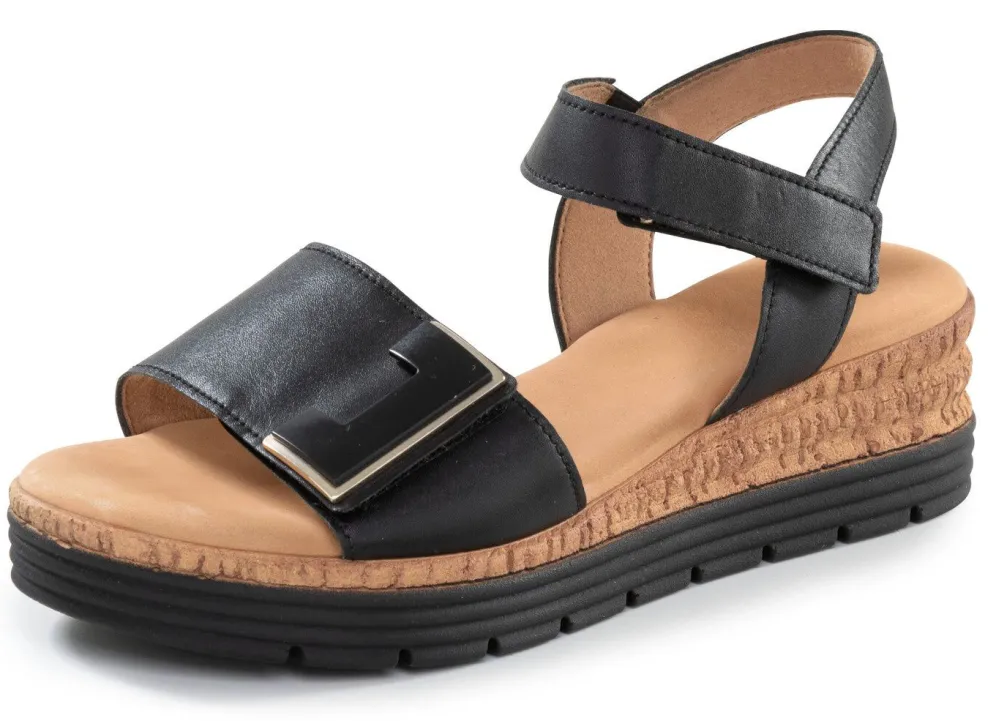 Sandaletten aus genarbtem Nappaleder mit dekorativer Klettspange: Weite G, Klettriemchen mit seitlichem Gummizug, Futter, gepolsterte Lederdecksohle, leichte 20 mm PU-Plateau-Laufsohle mit Kork-Optik und 50 mm Keilabsatz