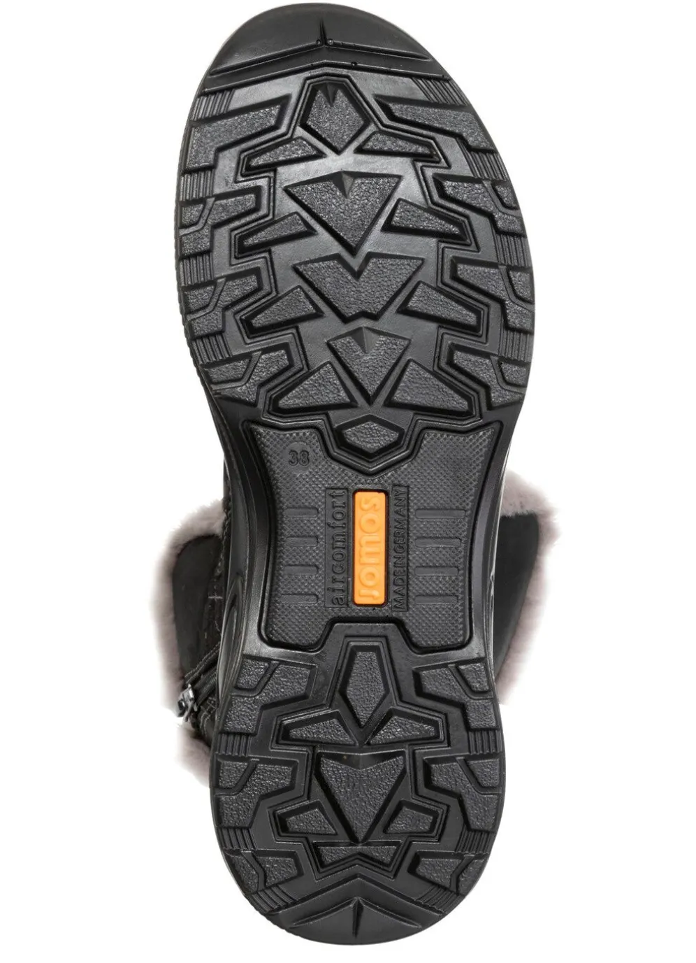 Schwarze Boots aus Nubukleder und Textilmaterial, mit hellem Plüschkragen, Schnürung und Innenreißverschluss: Weite H, mit Klimamembrane ausgestattet, Warmfutter, herausnehmbare Filz-Decksohle, leichte PUR-Profilsohle sowie 20 mm Keilabsatz. Schafthöhe ca. 14 cm