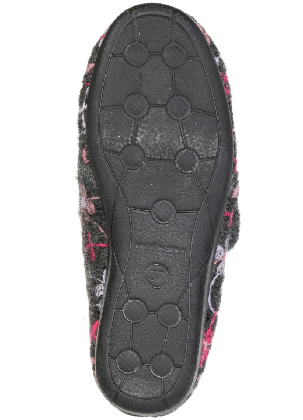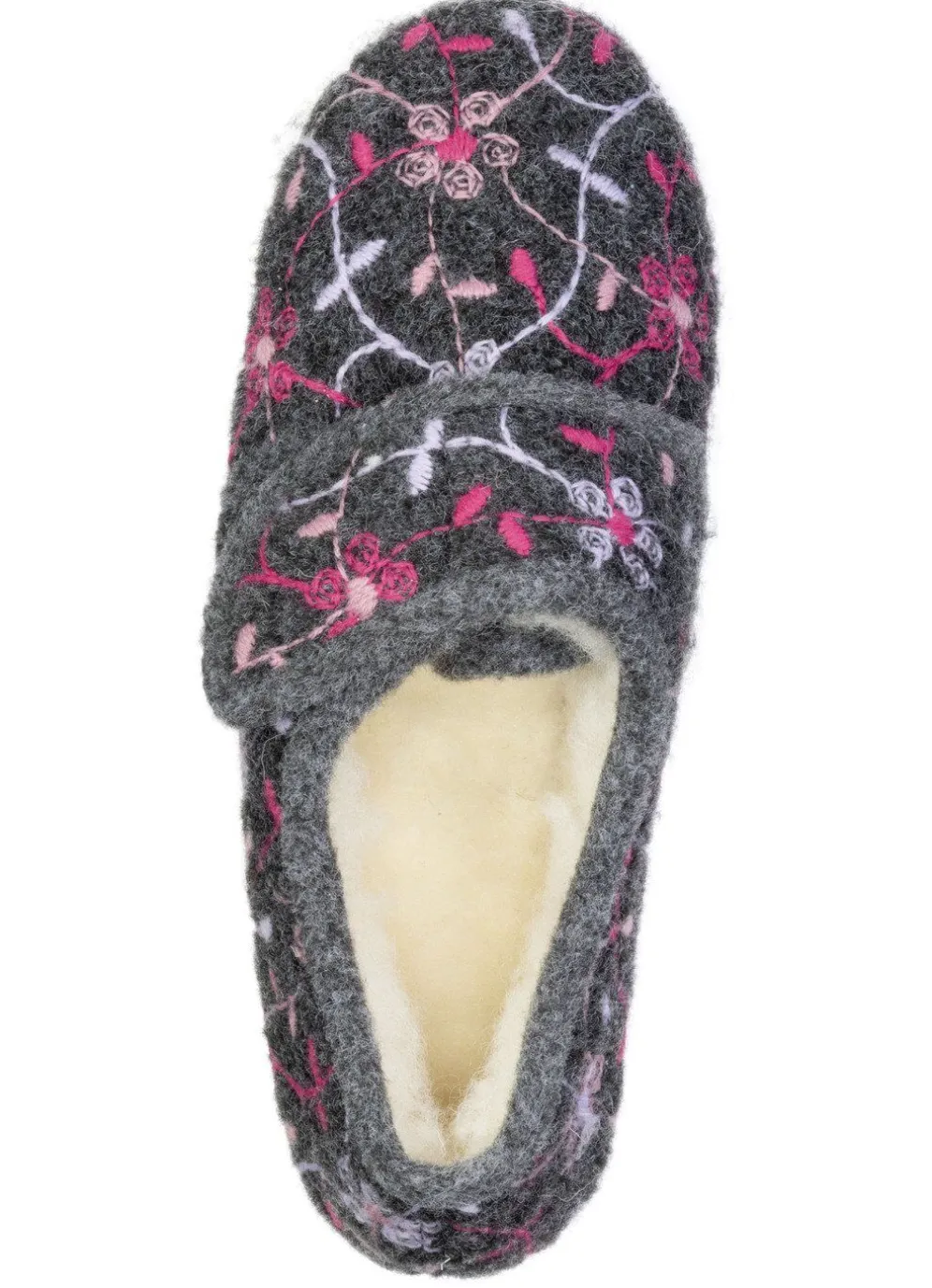 Hausschuhe in Anthrazit aus weichem Filz, mit bunter Blüten-Stickerei: verstellbare Klettspange, Warmfutter und Decksohlenbezug aus Schurwolle, leichte Gummi-Laufsohle sowie 20 mm Keilabsatz