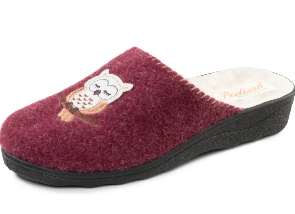 Hausschuhe aus weichem Filz mit niedlicher Eulen-Applikation: Warmfutter und Fußbettbezug aus reiner Schurwolle, superleichte Synthetik-Laufsohle sowie 20 mm Keilabsatz