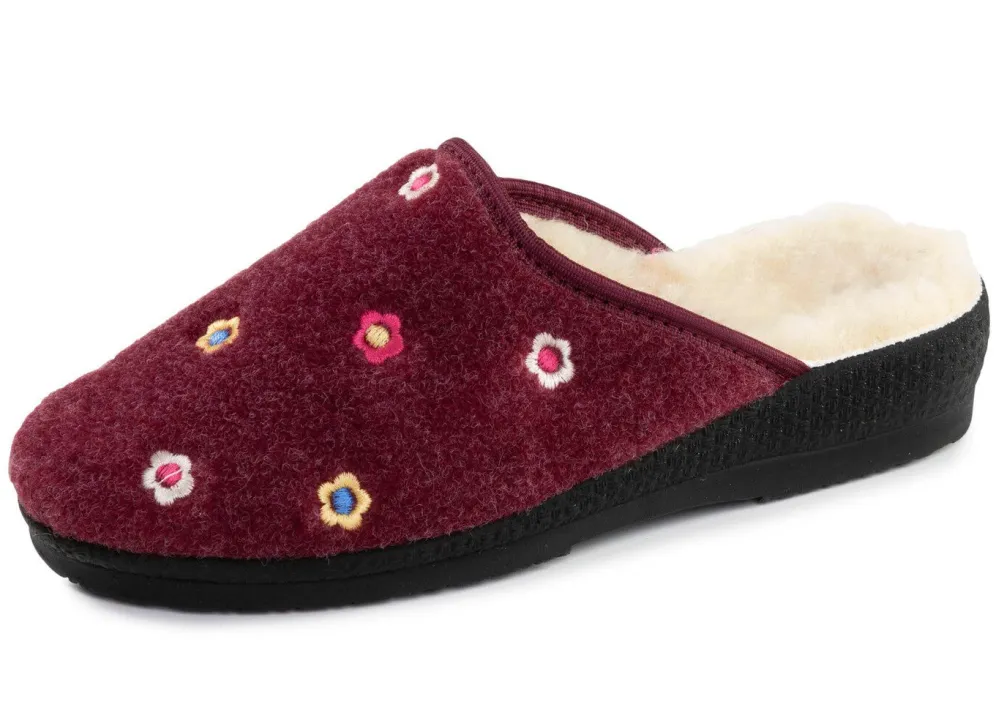 Hausschuhe aus Filz, mit bunter Blümchen-Stickerei: Warmfutter und Fußbettbezug aus reiner Schurwolle, leichte PU-Laufsohle sowie 20 mm Keilabsatz