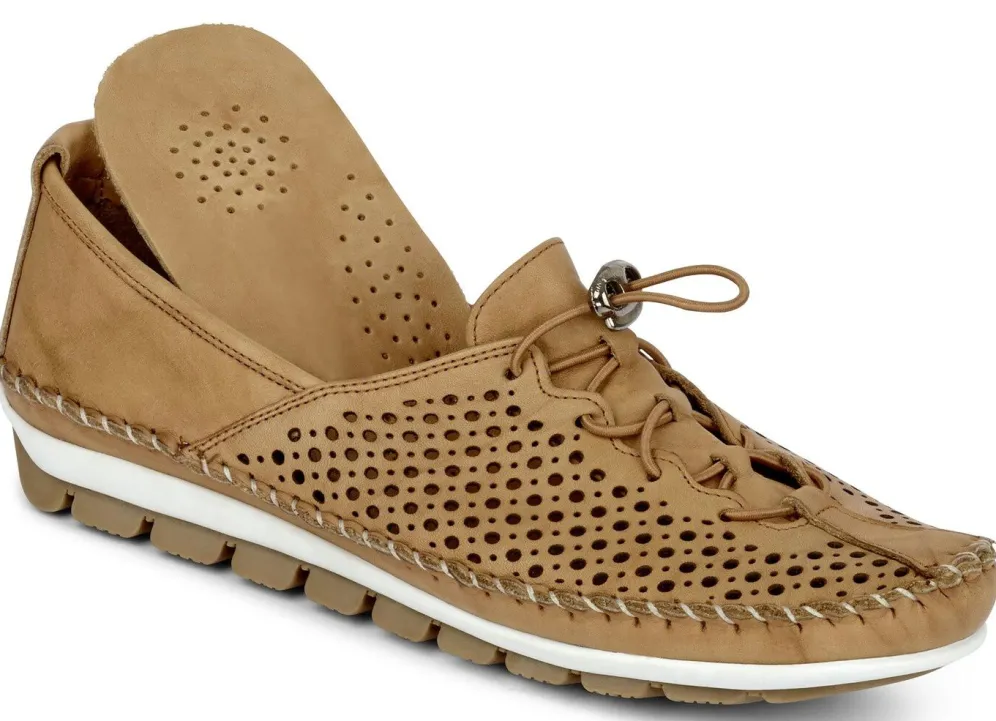 Perforierte Slipper aus schattiertem Rind-Nappaleder, in Mokassin-Machart: Weite G, elastisches Schnellschnürsystem mit Stopper, herausnehmbares Lederfußbett, leichte TR-Profilsohle, 15 mm Keilabsatz