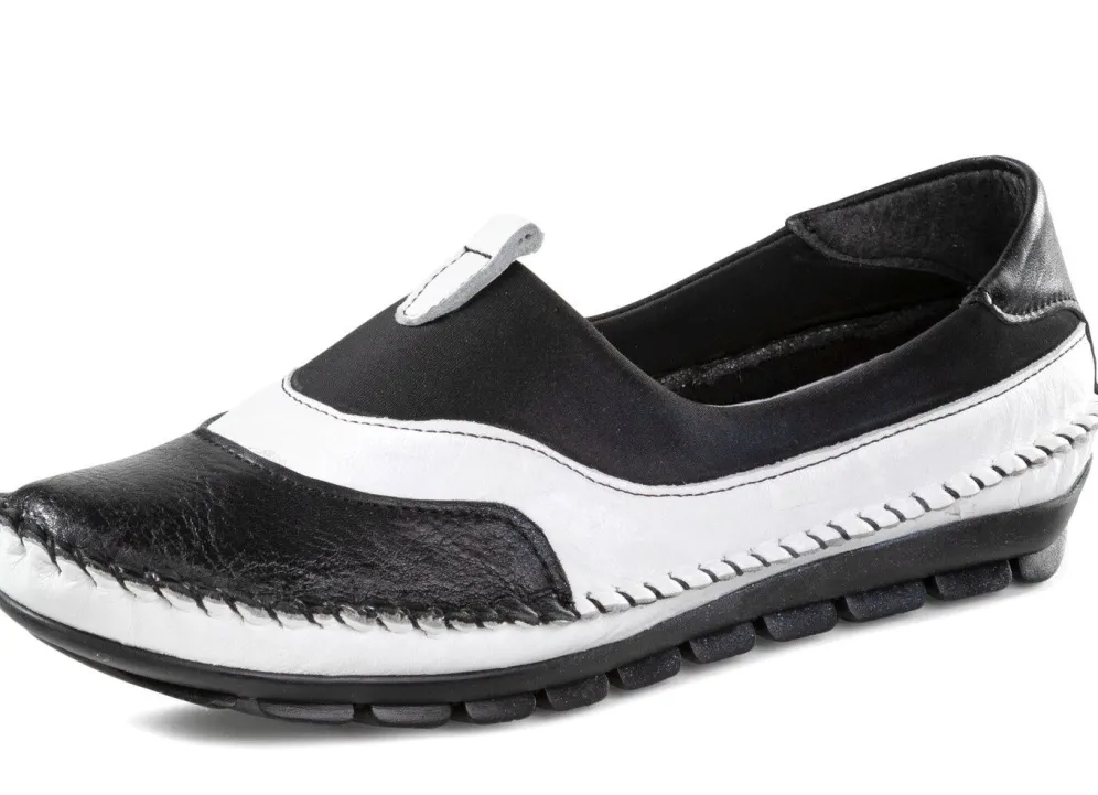 Slipper in Mokassin-Machart, aus weichem Rind-Nappaleder und elastischem Textilmaterial: Weite G, Textilfutter, herausnehmbares Lederfußbett, leichte TR-Profilsohle sowie 15 mm Keilabsatz