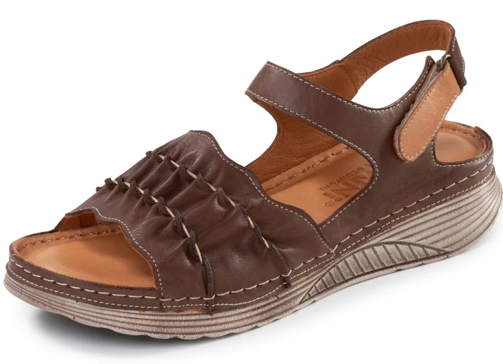 Sandalen aus weichem Rind-Nappaleder, mit Kordeldurchzügen, Raffung und cognacfarbener Fersen-Klettspange: Weite G, Lederfutter, gepolsterte Lederdecksohle sowie leichte PU-Laufsohle mit 20 mm Keilabsatz