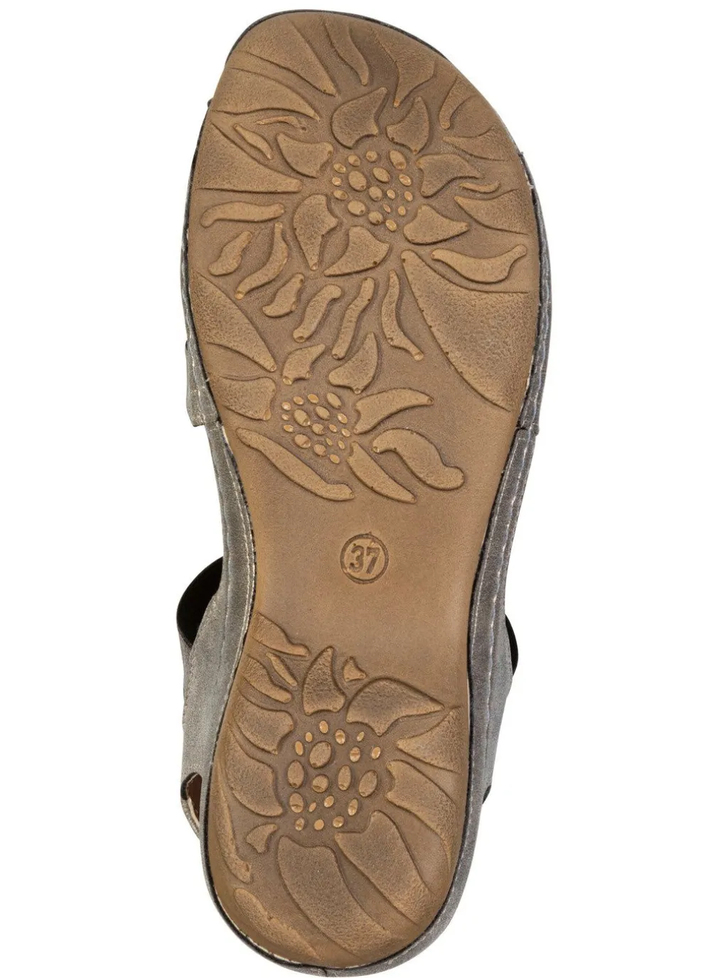 Sandalen aus feinem Synthetikmaterial mit Blüten-Applikationen und Elastikriemchen: Weite G, Futter, gepolsterte Lederdecksohle, leichte PU-Profilsohle mit 20 mm Keilabsatz