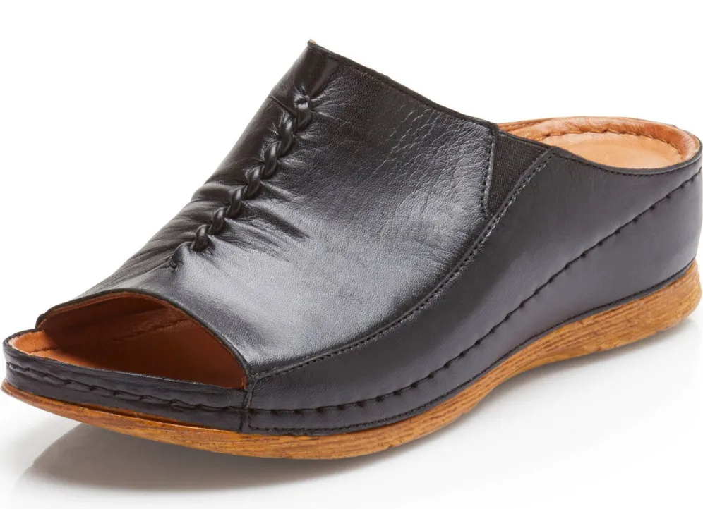 Pantolette aus teilweise schattiertem Rind-Nappaleder: in Weite G, seitliche Gummizüge, Lederfutter, gepolstertes Lederfußbett, superleichte PU-Laufsohle sowie 35 mm Keilabsatz