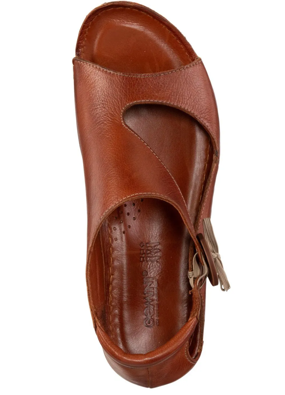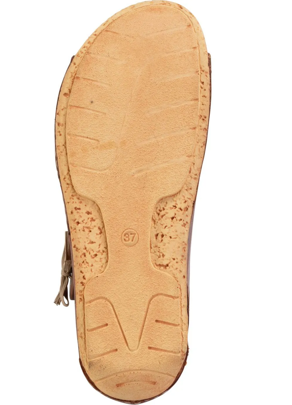 Sandale aus teils schattiertem Rind-Nappaleder: Weite G, seitliche Elastikschnürung mit Zierknopf, Lederfutter, gepolstertes Lederfußbett, superleichte PU-Laufsohle sowie 25 mm Keilabsatz