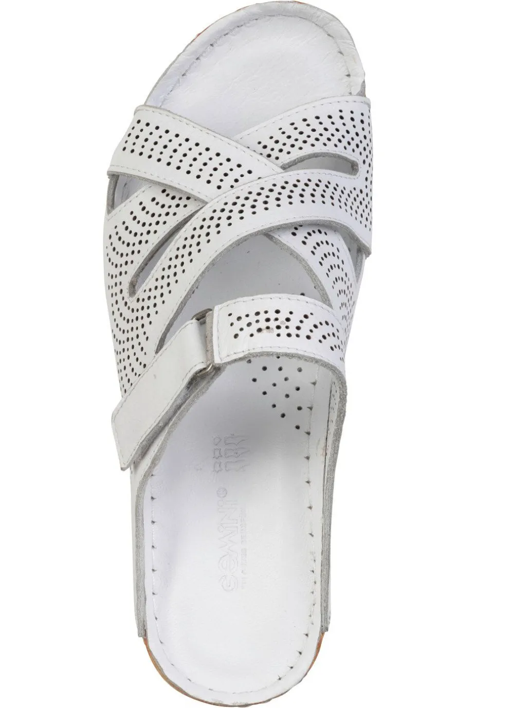 Pantoletten aus perforiertem Nappaleder: Weite G, verstellbare Klettspange mit Elastikeinsatz, Lederfutter, gepolstertes Lederfußbett, superleichte PU-Laufsohle sowie 25 mm Keilabsatz