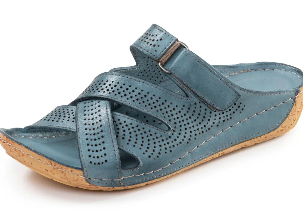 Pantoletten aus perforiertem Nappaleder: Weite G, verstellbare Klettspange mit Elastikeinsatz, Lederfutter, gepolstertes Lederfußbett, superleichte PU-Laufsohle sowie 25 mm Keilabsatz