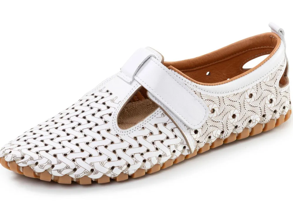 Slipper aus perforiertem, geprägtem Rind-Nappaleder mit dezenter Schattierung: Weite G, verstellbare Klettspange, Lederfutter, herausnehmbares Fußbett, superleichte PU-Handnaht-Noppensohle mit 10 mm Keilabsatz