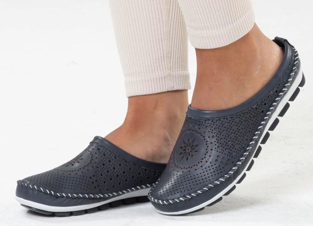 Sabot aus luftig perforiertem, geprägtem Nappaleder in Mokassin-Machart: Weite G, herausnehmbares Lederfußbett, leichte TR-Profilsohle sowie 15 mm Keilabsatz