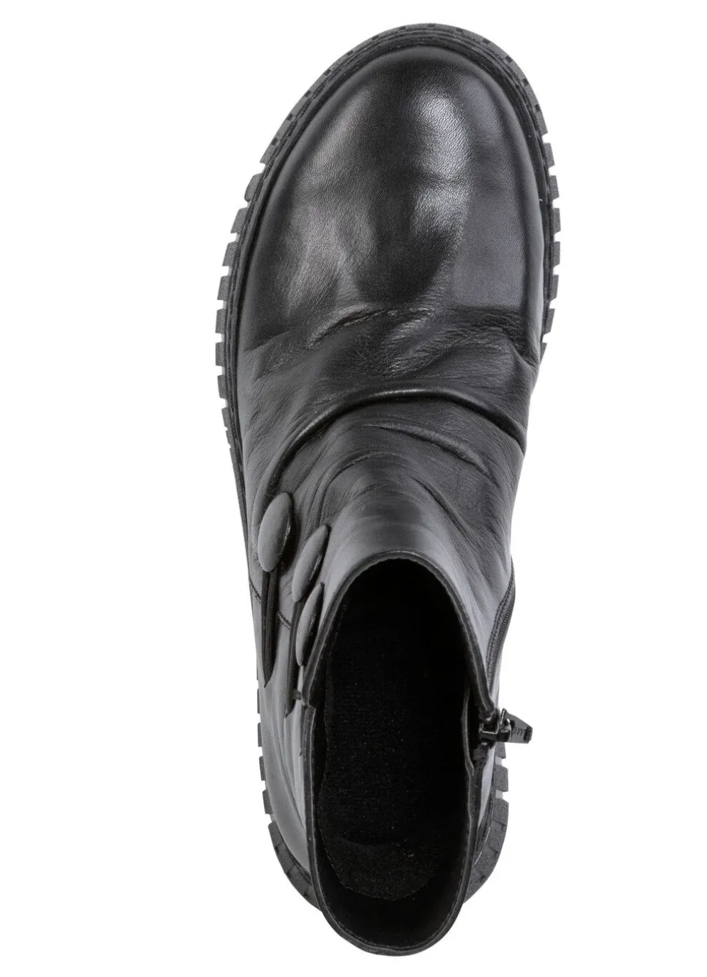 Stiefelette aus weichem Rind-Nappaleder, mit Raffung und dekorativen Knöpfen: Weite G, Innenreißverschluss, wärmendes Textilfutter, herausnehmbares Fußbett, leichte Gummilaufsohle, 10 mm Keilabsatz. Schafthöhe ca. 14 cm