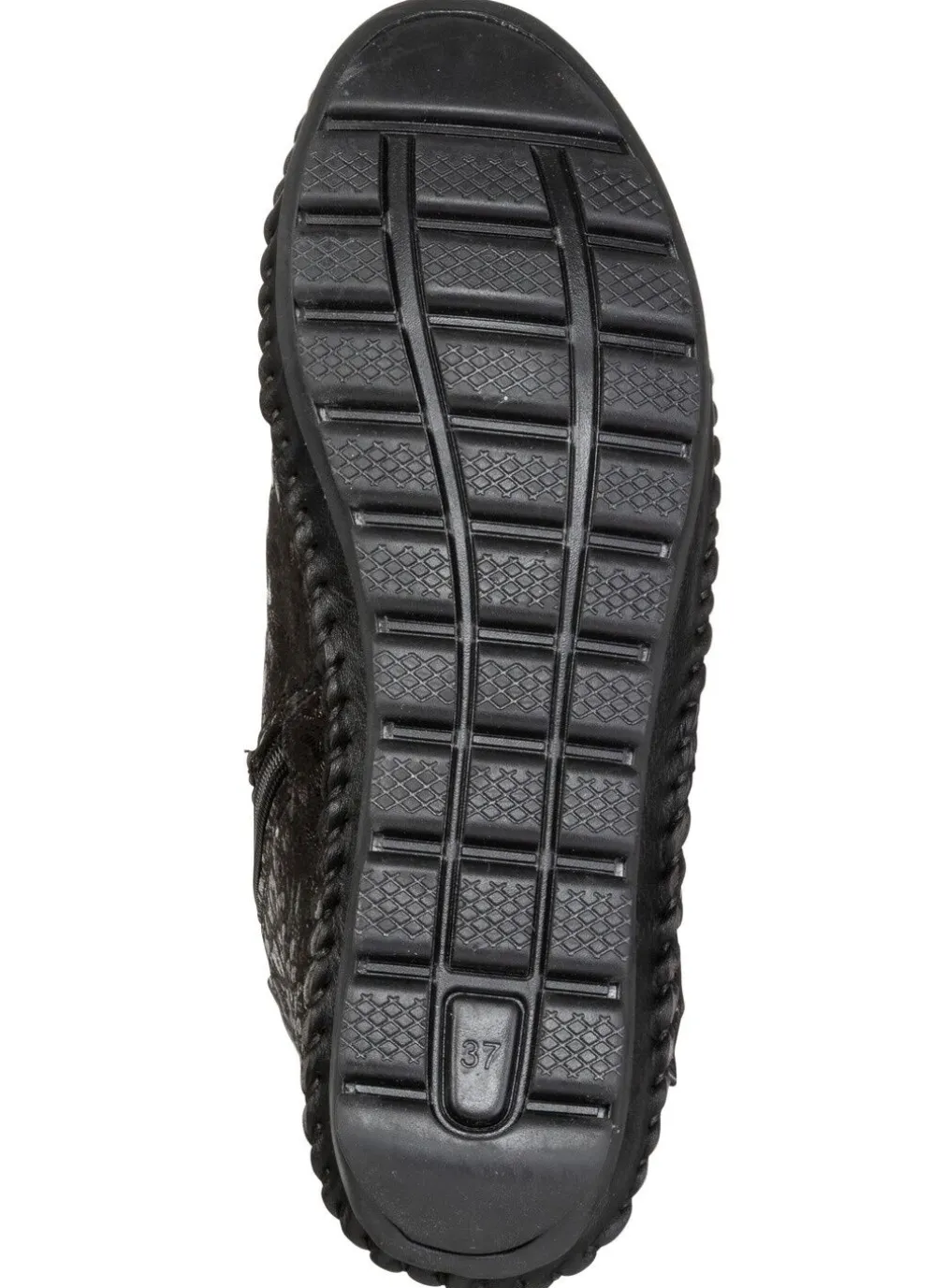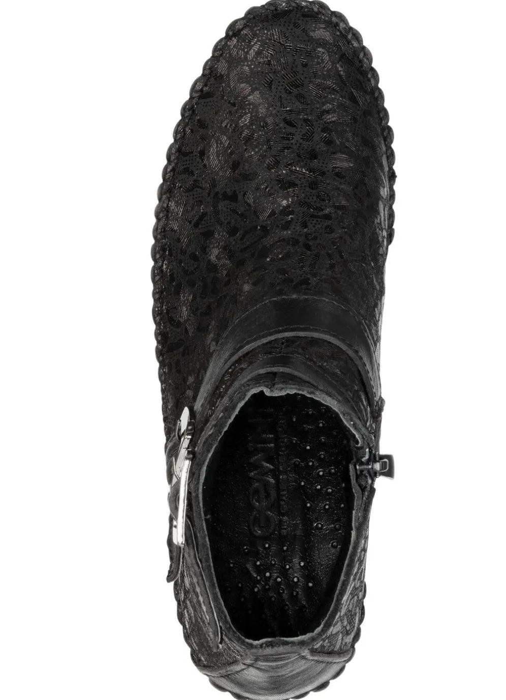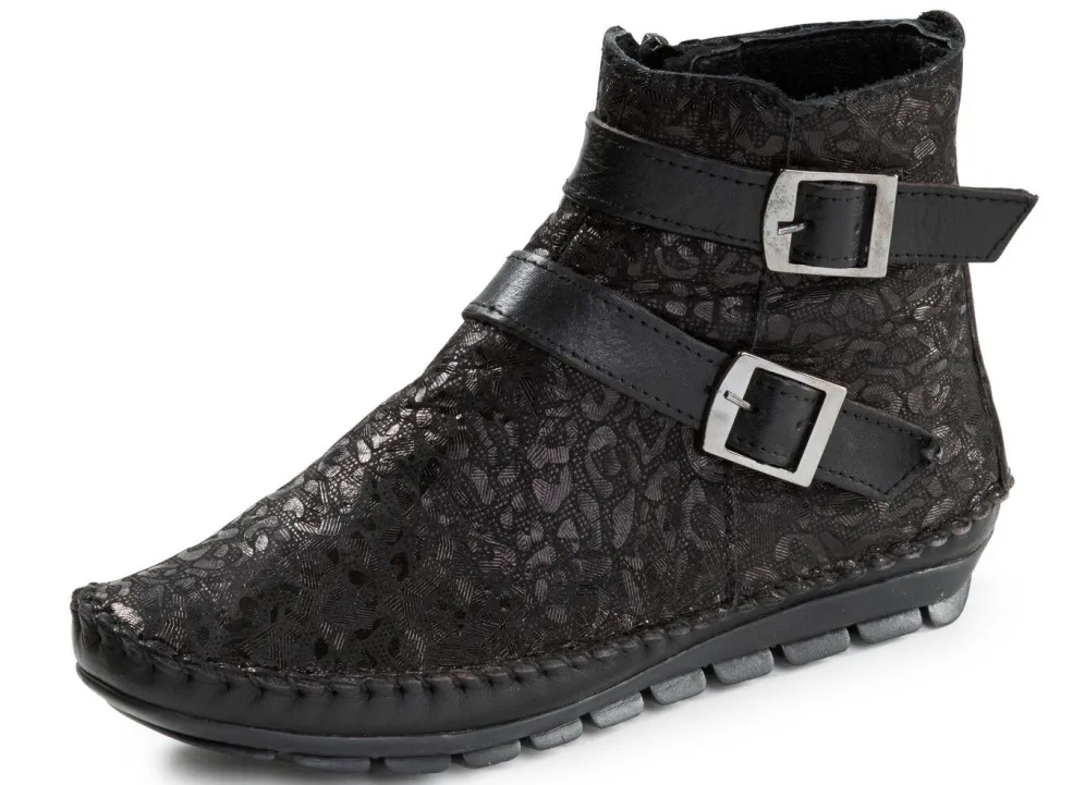 Boots in Mokassin-Machart, aus bedrucktem Nubukleder, in Schwarz aus schimmernd geprägtem Nappaleder: Weite G, zwei Zierspangen aus Nappaleder, Innenreißverschluss, Textilfutter, herausnehmbares Lederfußbett, leichte TR-Profilsohle sowie 15 mm Keilabsatz. Schafthöhe ca. 12 cm