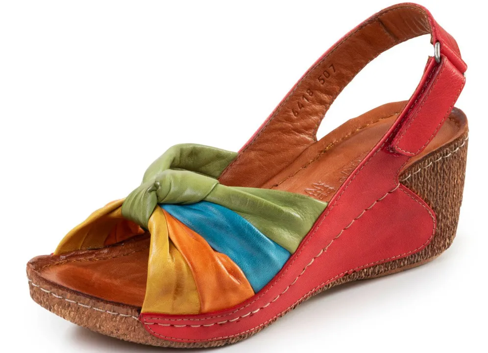 Sandaletten aus teilweise schattiertem Nappaleder, mit weichen Schlauchriemchen: Weite G, verstellbare Klettspange, Lederfutter, gepolsterte Lederdecksohle, leichte PU-Laufsohle mit 50 mm Keilabsatz