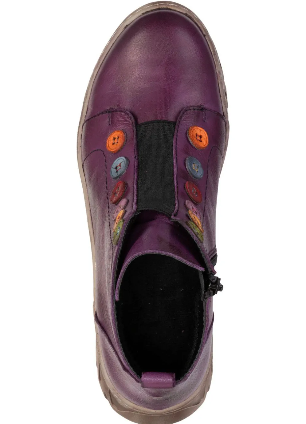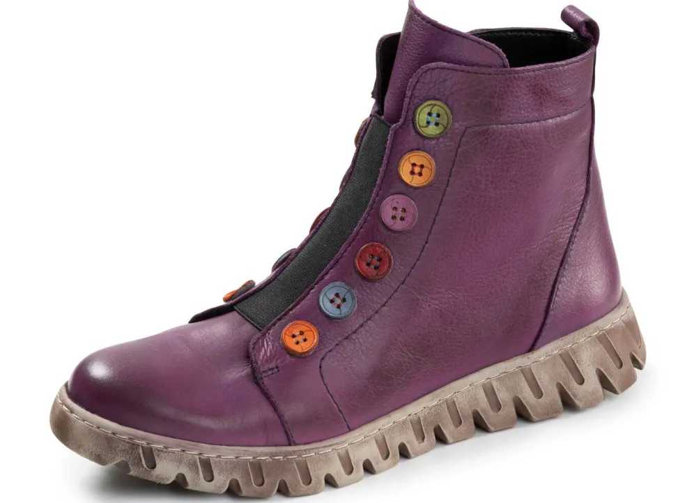 Stiefeletten aus schattiertem Rind-Nappa- oder Nubukleder, mit Elastikeinsatz und bunten Zier-Lederknöpfen: Weite G, Innenreißverschluss, wärmendes Textilfutter, herausnehmbares Fußbett, leichte TPR-Profilsohle, 15 mm Keil. Schafthöhe ca. 12 cm