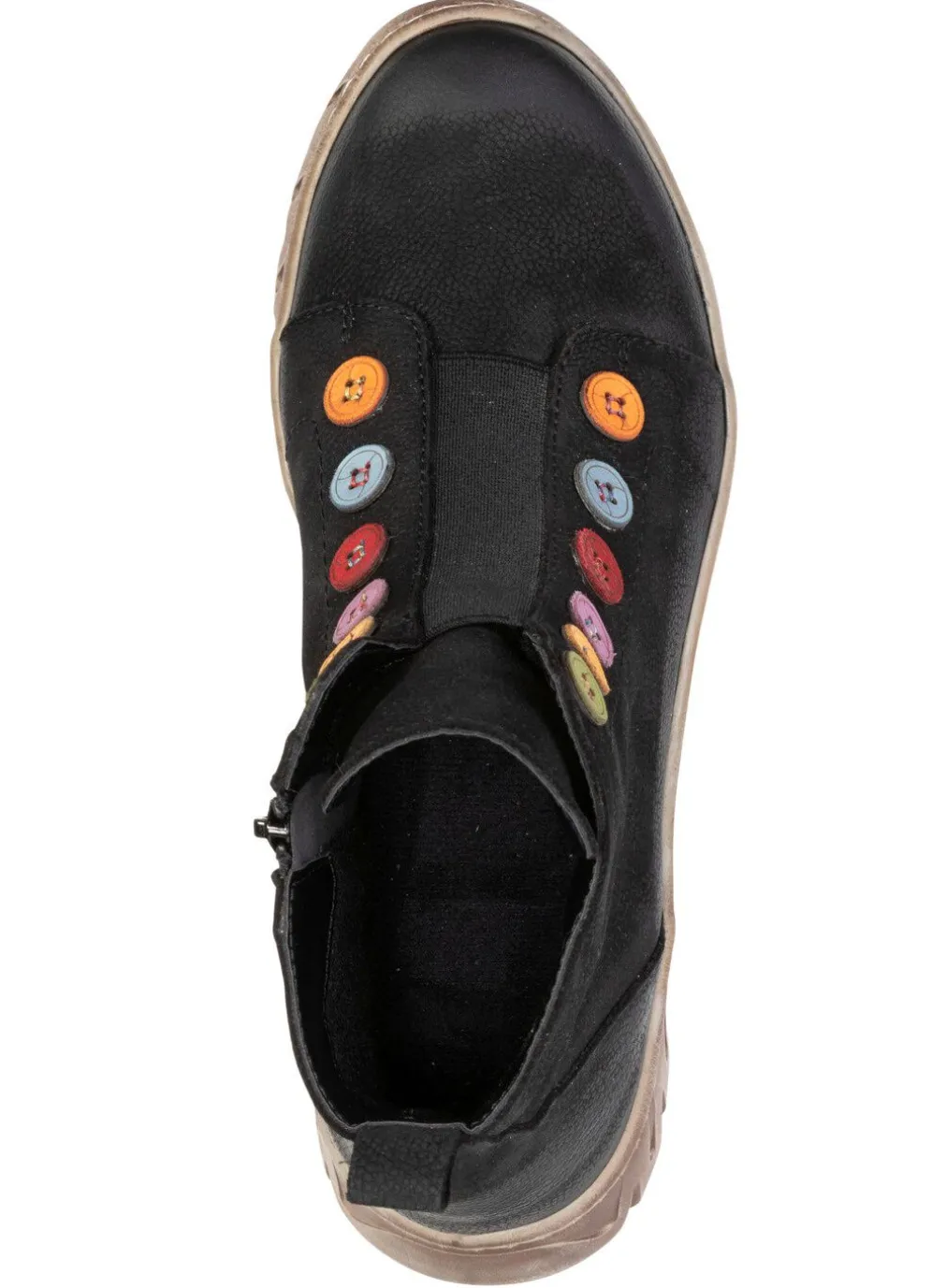 Stiefeletten aus schattiertem Rind-Nappa- oder Nubukleder, mit Elastikeinsatz und bunten Zier-Lederknöpfen: Weite G, Innenreißverschluss, wärmendes Textilfutter, herausnehmbares Fußbett, leichte TPR-Profilsohle, 15 mm Keil. Schafthöhe ca. 12 cm