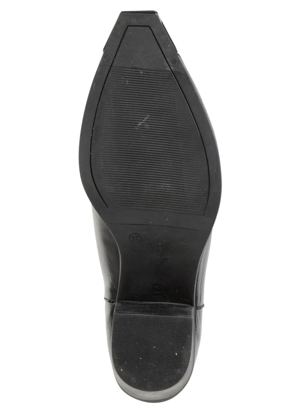 Trendiger Western-Stiefel aus Rind-Nappaleder, in Schwarz aus Knautschlackleder, mit Ziernähten: Weite G, wärmendes Textilfutter, gepolsterte Decksohle, leichte TR-Riffelsohle mit Metallspitze sowie 50 mm Absatz. Schafthöhe ca. 20 cm