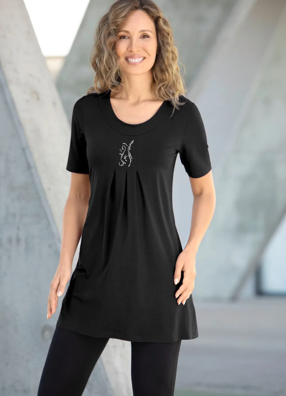 Vielseitig tragbar ist dieses geschmackvolle Longshirt mit Faltenlegung, Plättchen- und Strasszier im Vorderteil.