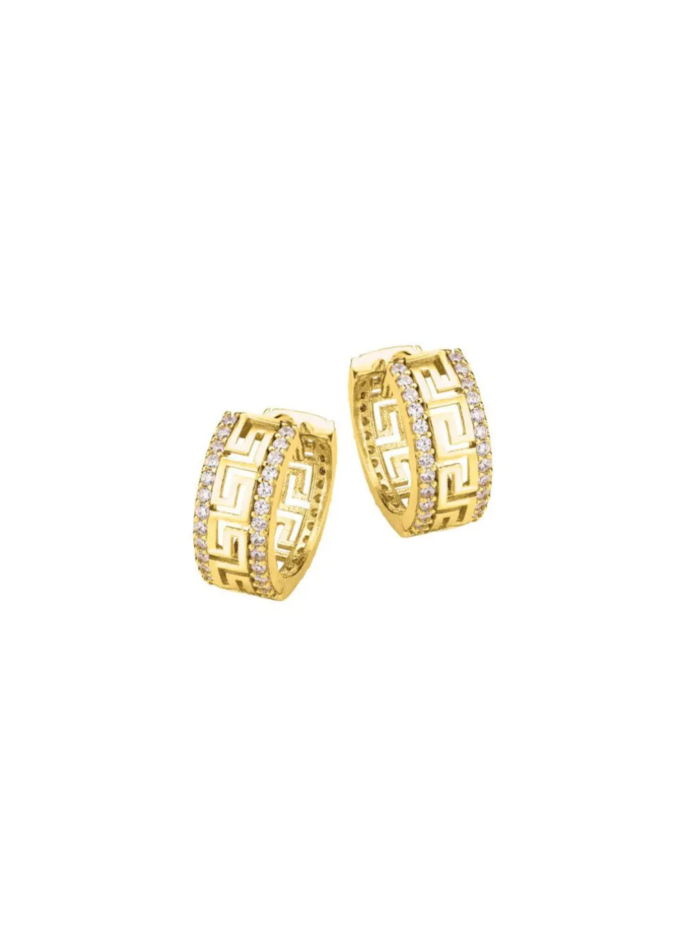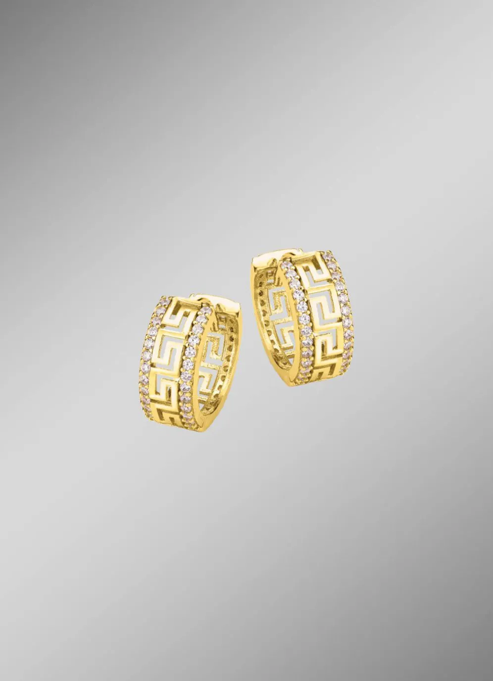 aus Gold 375/-fein mit Meandermuster Diese stilvollen Klappcreolen aus feinem Gold 375/- vereinen klassische Symbolik mit funkelnder Eleganz. Das kunstvolle Meandermuster, Sinnbild für Unendlichkeit und Harmonie, wird durch edle synthetische Zirkonia effektvoll in Szene gesetzt.