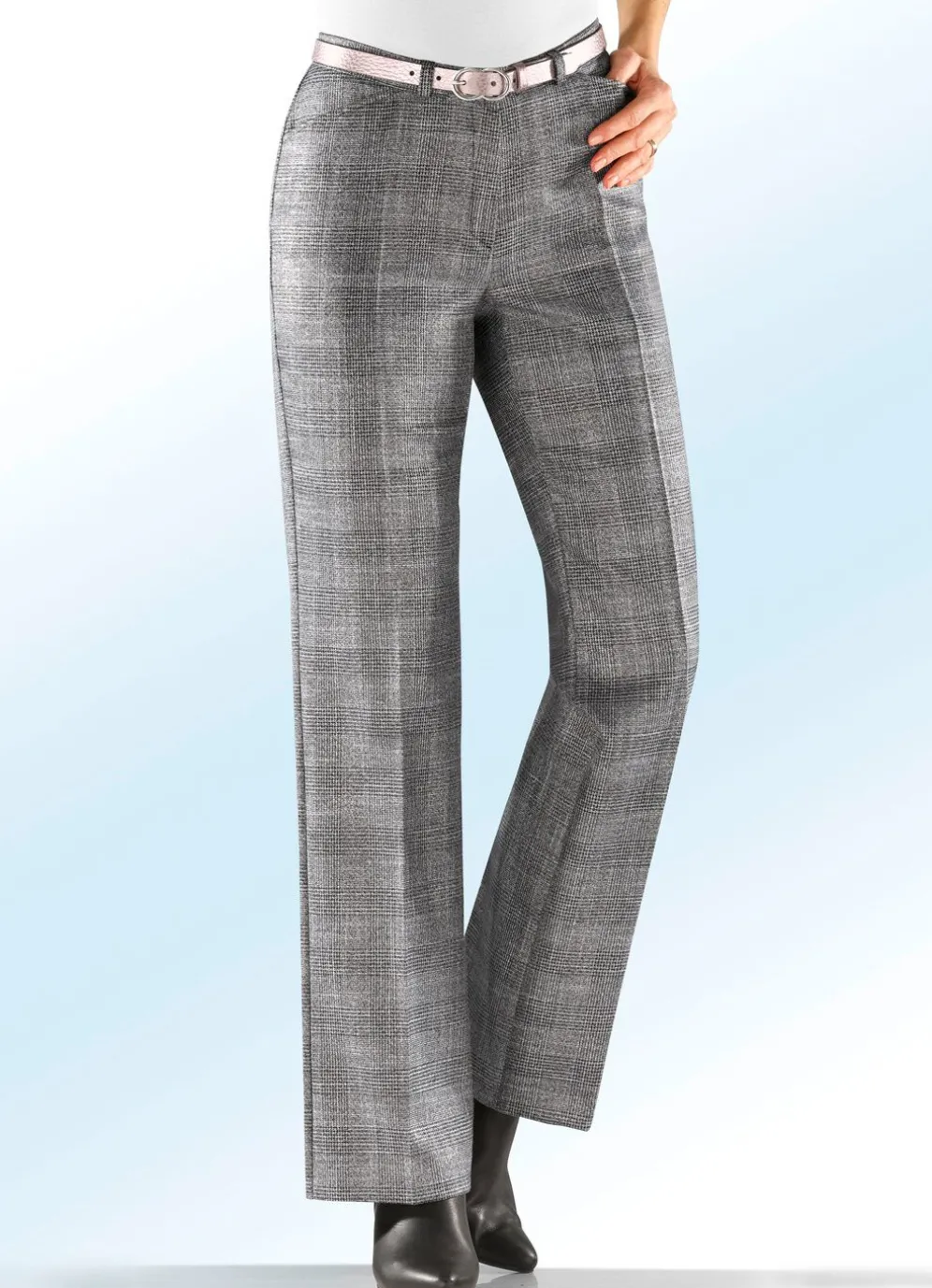 Mit viel Chic präsentiert sich diese edel schimmernde schwarz-hellgrau-goldfarbene Glencheck-Hose in leicht ausgestellter Fußweite, mit Stretchbund, Gürtelschlaufen, Haken- und Reißverschluss sowie Seitentaschen. Innenbeinlänge ca. 80 cm, Fußweite ab 50 cm.