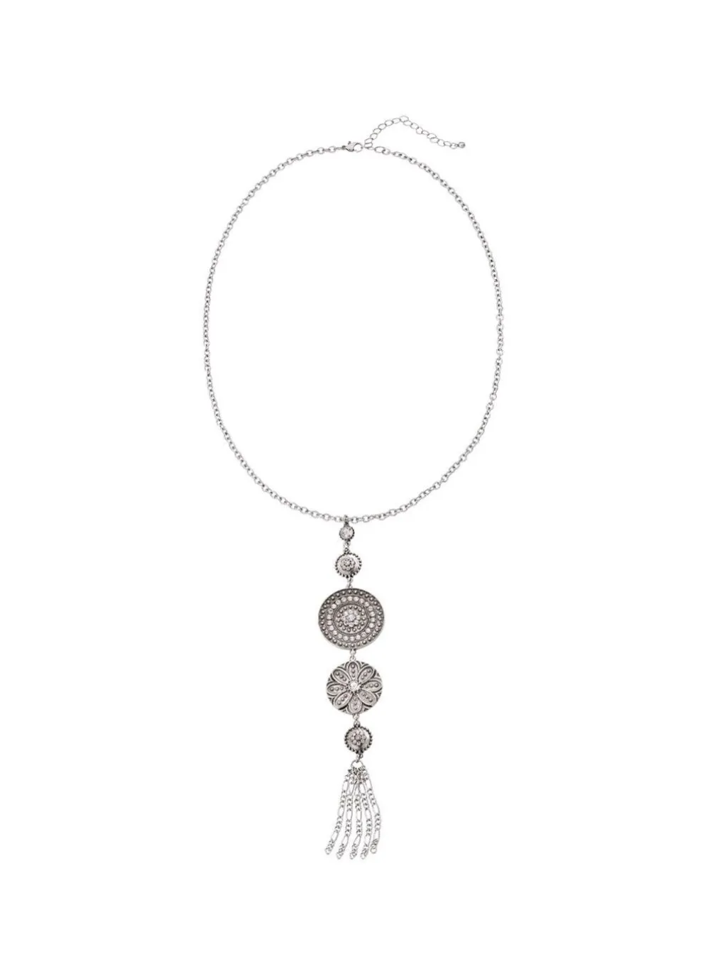 Die „Y“-Form der Halskette zahlt sich aus! Genau die richtige Wirkung, um diverse Alltagsoutfits zu begleiten. Dieses modische, silberfarbene Schmuckstück mit Anhänger und einer Quaste aus Metall hat eine Länge von 62 cm und kann um 6 cm verlängert werden.
