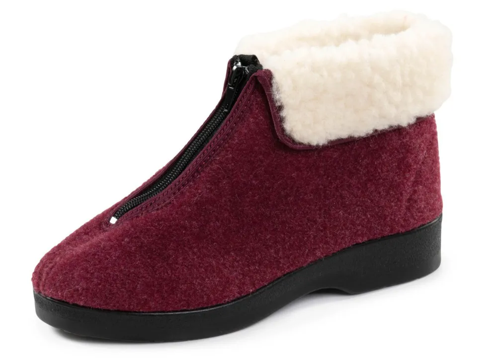 Haus-Stiefelette aus bordeauxfarbenem Filz, mit praktischem Front-Reißverschluss: Weite H, Plüschkragen, Warmfutter und Decksohlenbezug aus reiner Wolle, superleichte PU-Laufsohle, 20 mm Keilabsatz. Schafthöhe ca. 11 cm