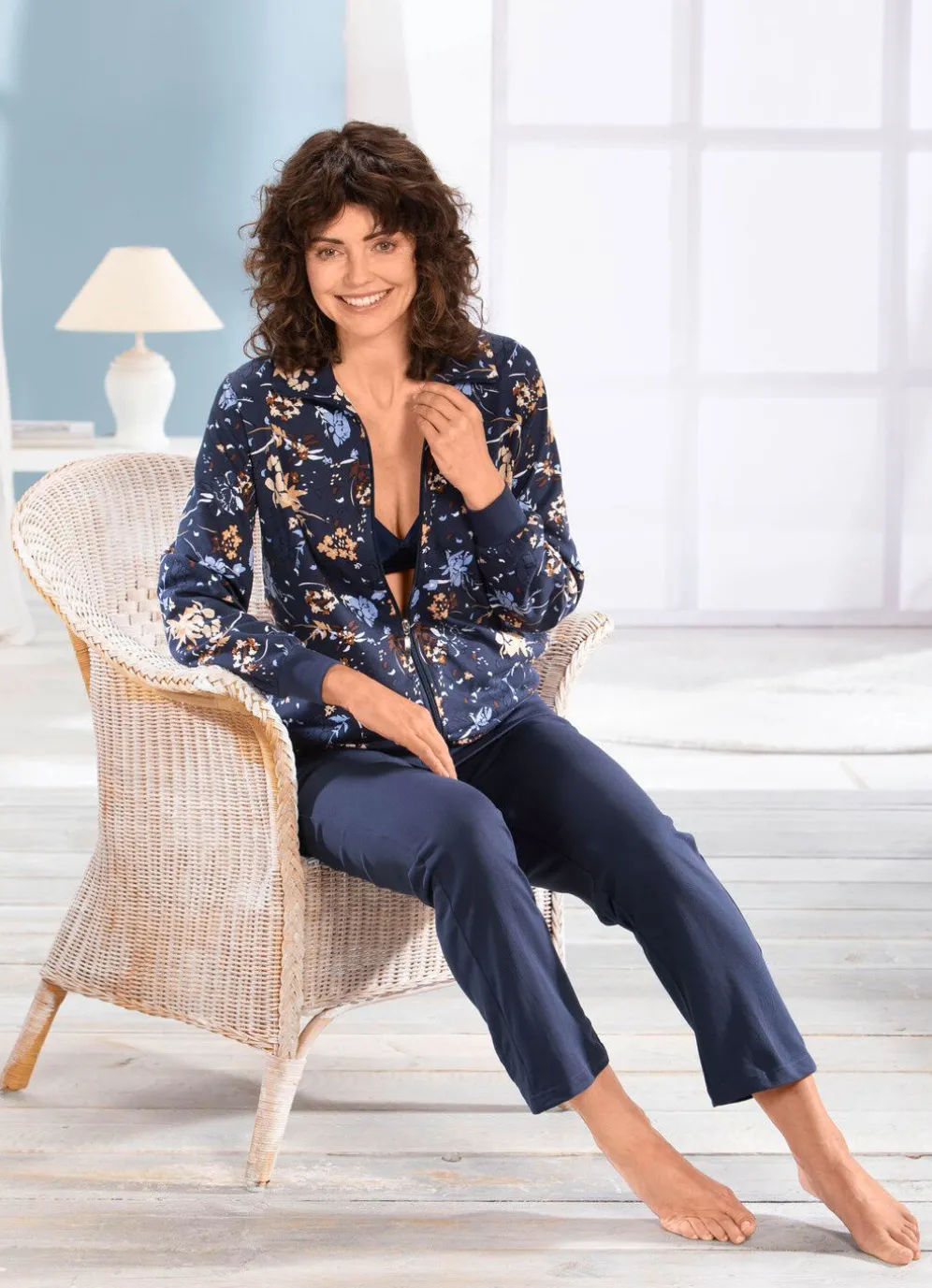 Schöner Hausanzug von „Comtessa“ in Marine-Braun-Hellblau-Bunt! Das Oberteil präsentiert sich mit einem Blumen-Blätter-Druck allover, durchgehendem Reißverschluss, zwei Seitennahttaschen sowie Bündchen an den langen Ärmeln und am Saum.