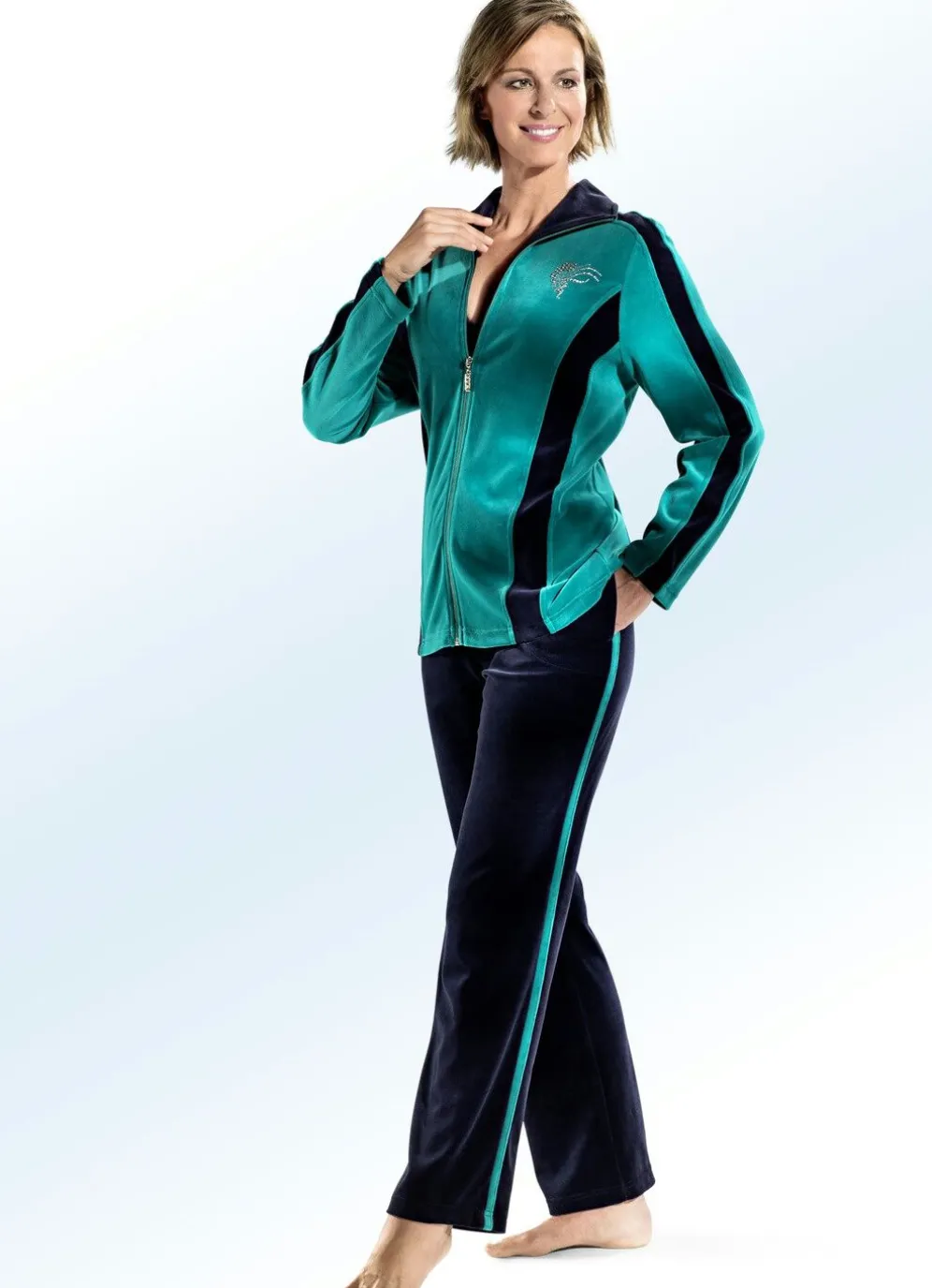 Exquisiter COMODO-Hausanzug: Oberteil mit durchgehendem Reißverschluss, Strasssteinzier im Vorderteil sowie Kontrasteinsätzen an den Wiener Nähten und an den Ärmeln.