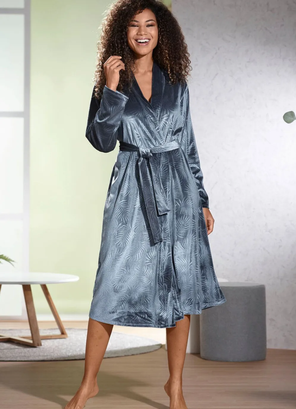 Schickes und elegantes Design: wadenlanger, rauchblauer „Laurina”-Hausmantel in Kimono-Form mit Gürtelschlaufen und Bindegürtel sowie innerer Bindemöglichkeit.