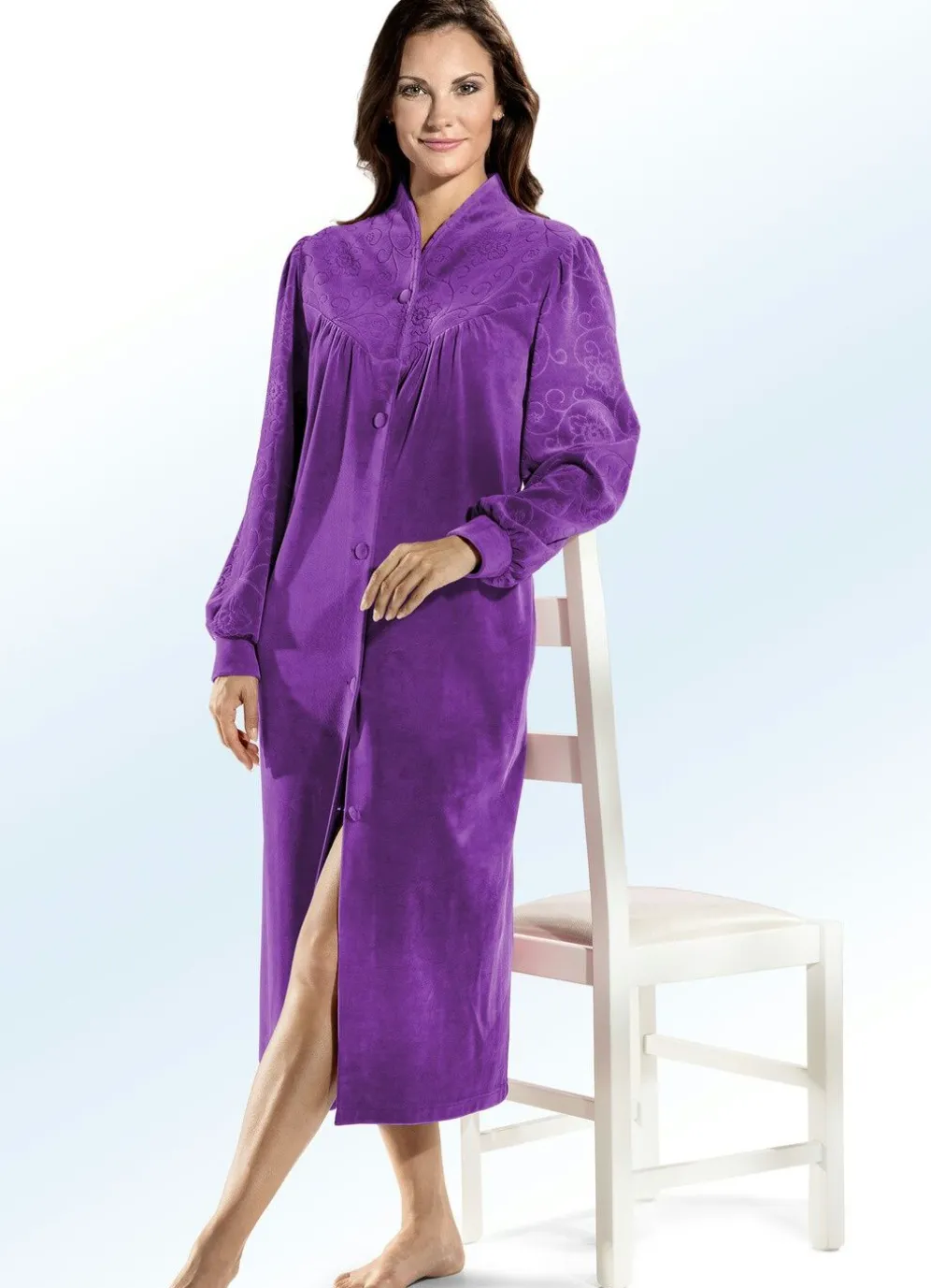 Stilvoller Hausmantel in durchgeknöpfter, wadenlanger Form. Das Modell zeigt sich mit Kelchkragen, zauberhafter Strukturierung an der Vorderpasse und an den langen Ärmeln sowie zwei Seitennahttaschen.