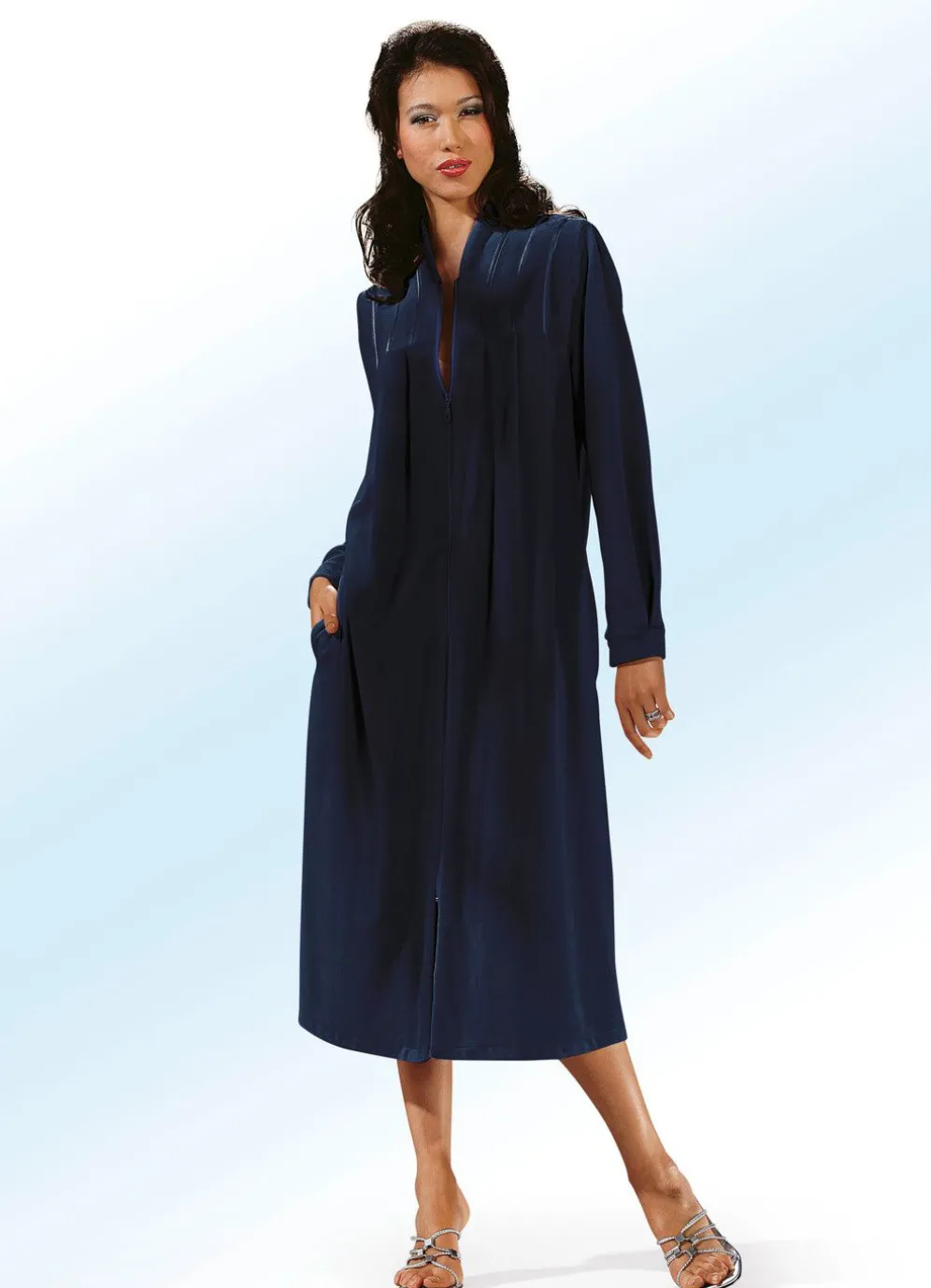 Geschmackvoller, wadenlanger Hausmantel von COMODO mit durchgehendem Reißverschluss, Kelchkragen, Satinbandzier und dezenten Raffungen an der Vorderpasse sowie zwei Seitennahttaschen.