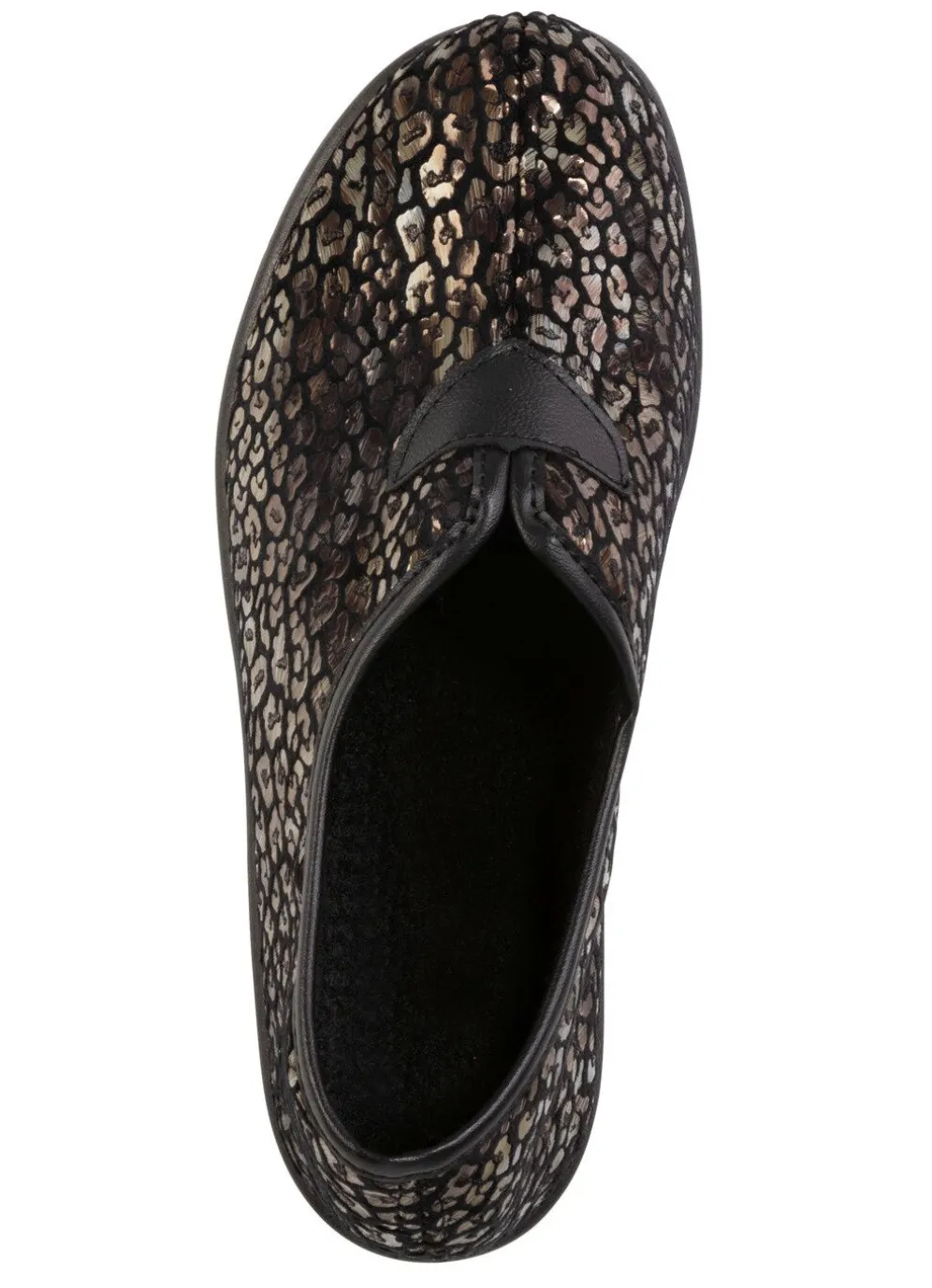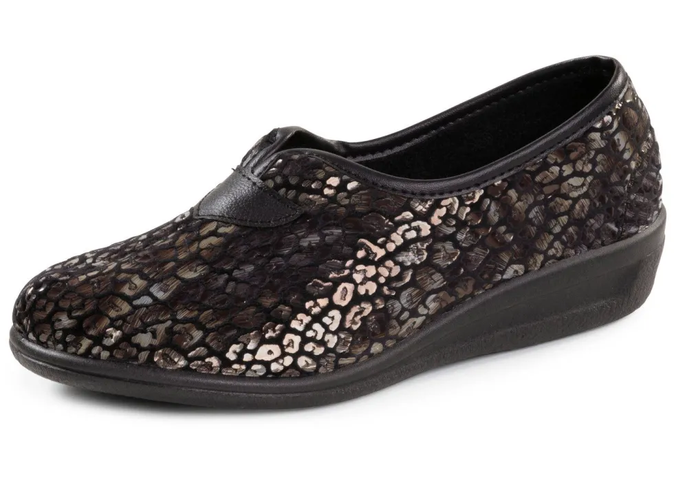 Hausschuh in Schwarz-Bronze aus glänzend bedrucktem Samt in Leo-Muster: Textilfutter, gepolsterte Decksohle, superleichte PVC-Laufsohle sowie 30 mm Keilabsatz