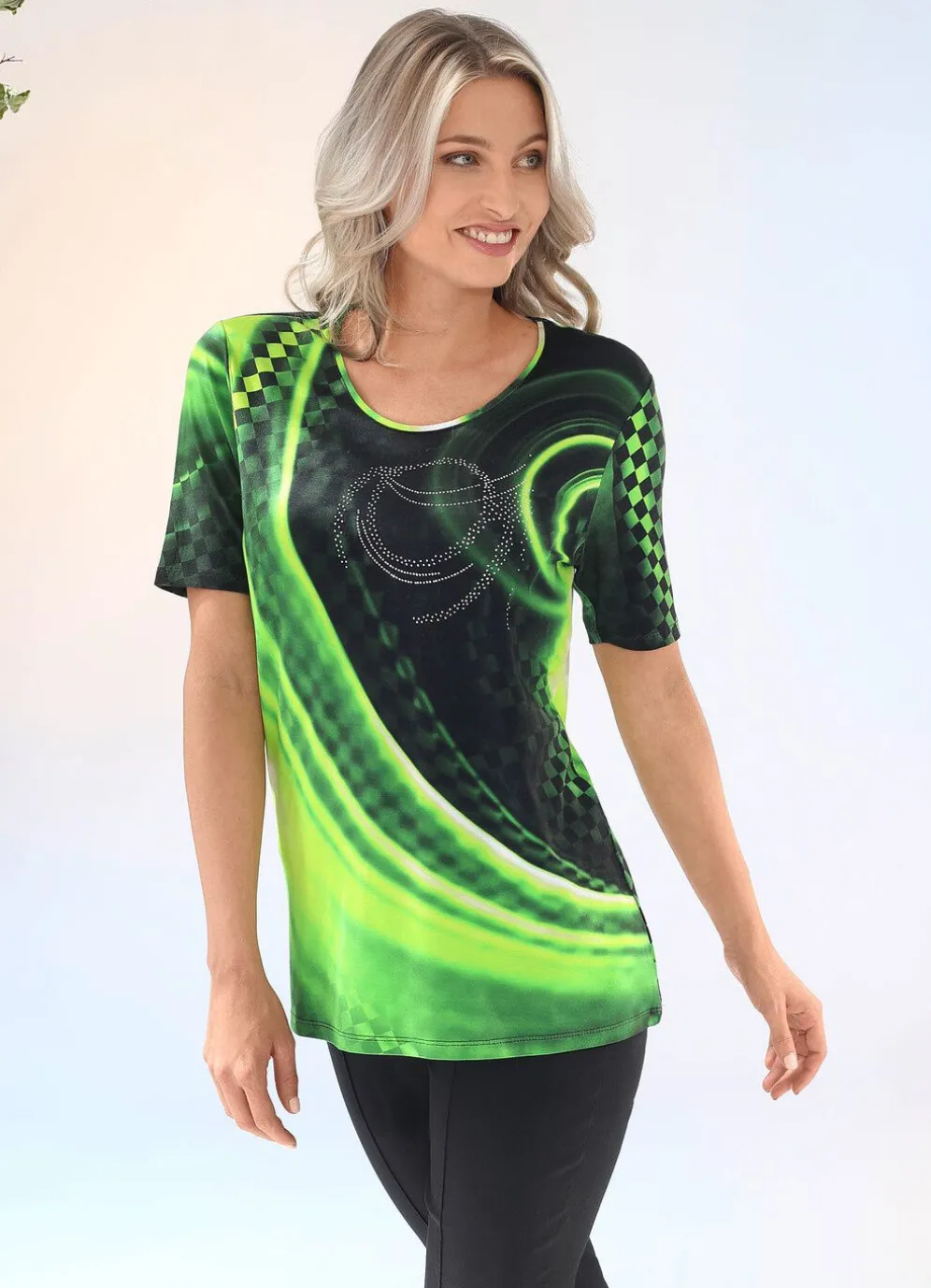 Hinreißendes Shirt mit farbbrillantem Inkjet-Druck in Schwarz-Neongrün allover und silberfarbenen Zierplättchen im Vorderteil.