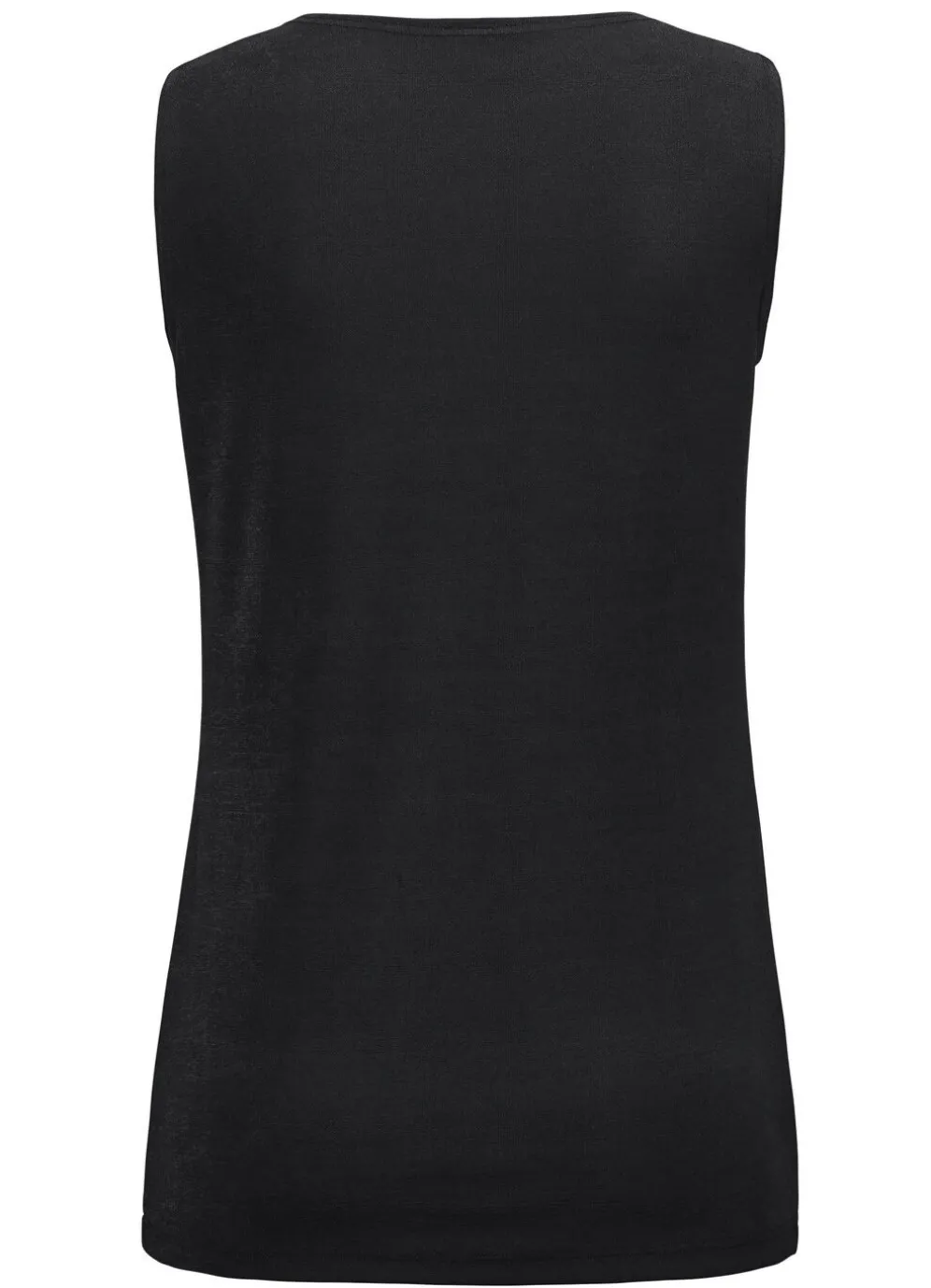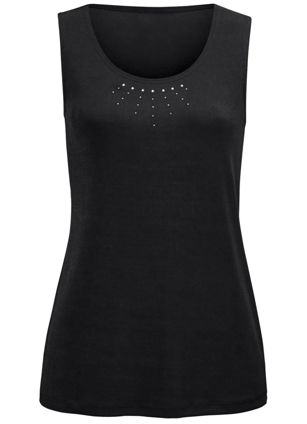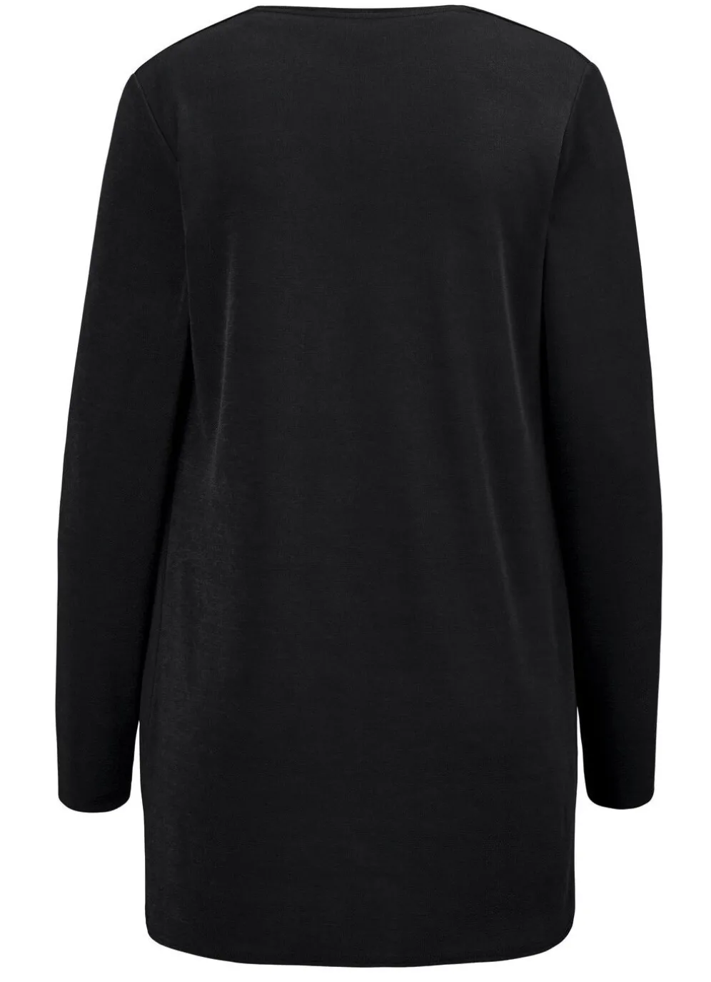 Hinreißendes, 2-teiliges Twin-Set! Bestehend aus einer Shirtjacke in legerer verschlussloser Form, Länge ca. 78 cm ab Gr. 46 ca. 81 cm sowie unifarbenes Trägershirt mit edler Strasszier im Vorderteil, Länge ca. 68 cm, ab Gr. 46 ca. 71 cm.