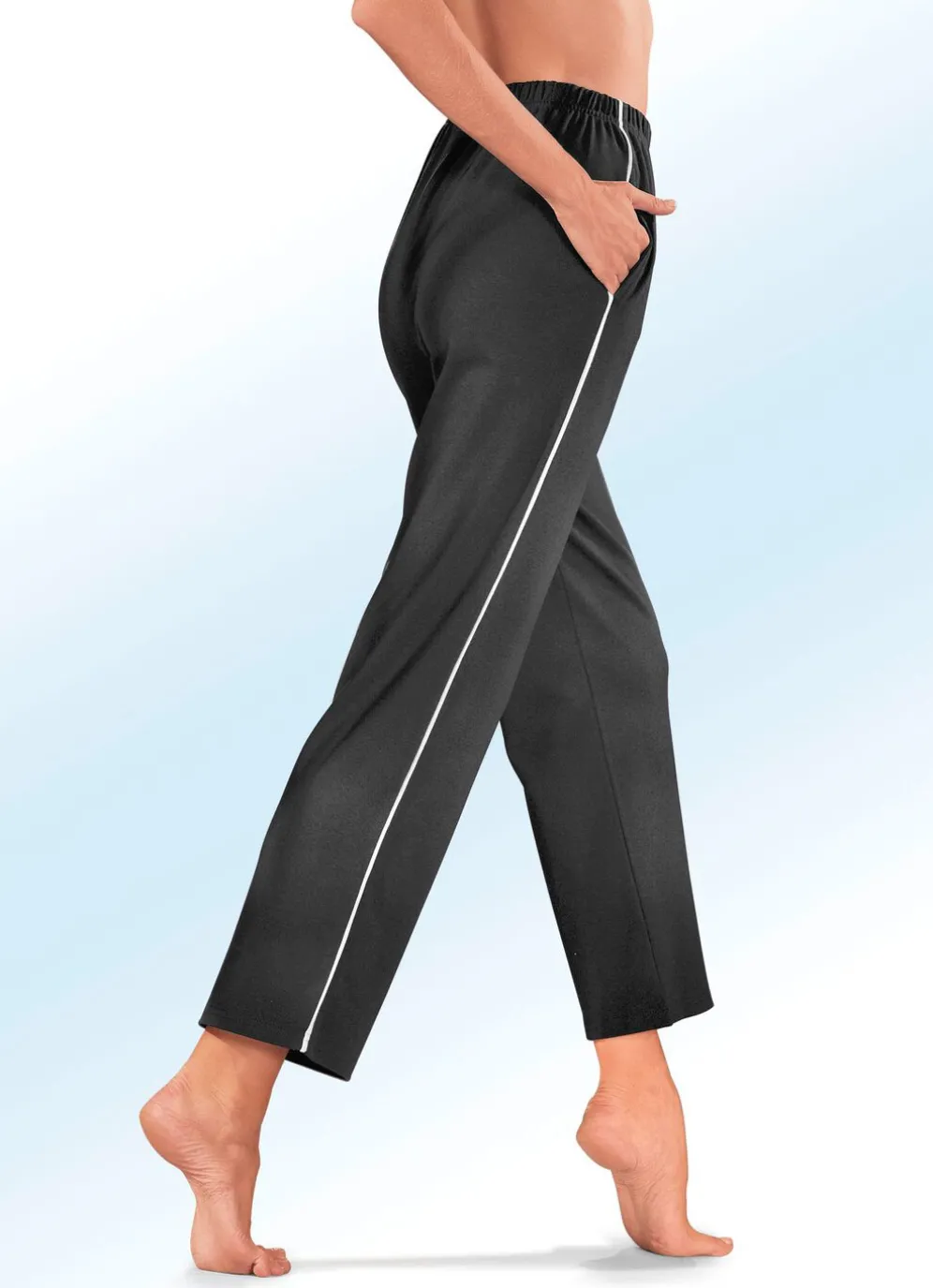 Ein perfekter Partner für Sport und Freizeit ist diese lange Hose mit Dehnbund, Seitennahttasche sowie weißer Paspel entlang der Seitennaht.