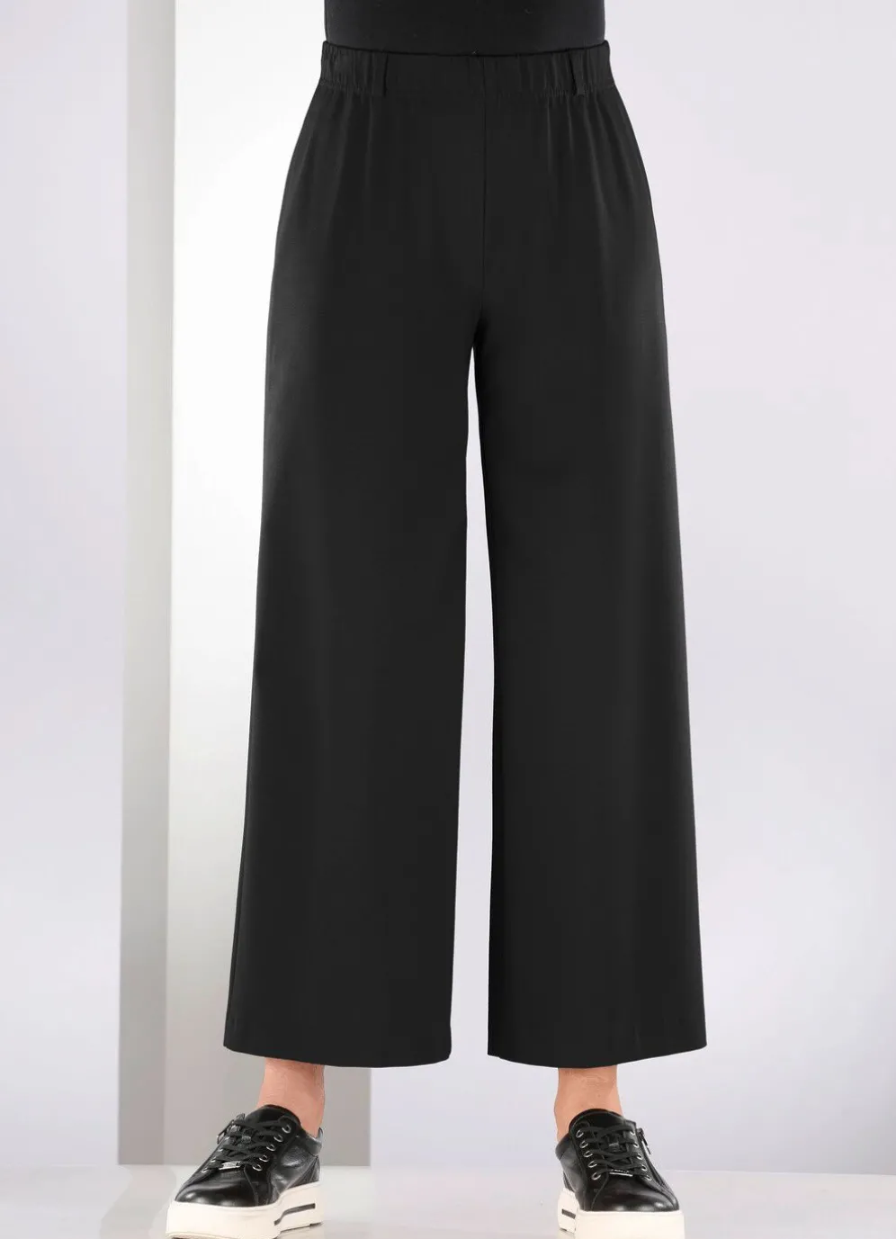Ein absolutes Highlight ist diese bequeme, knöchellange Hose in Palazzo-Form: weiter Beinverlauf, Schlupfform mit Dehnbund rundum sowie Gürtelschlaufen. Innenbeinlänge ca. 68 cm, Fußweite ab 65 cm.
