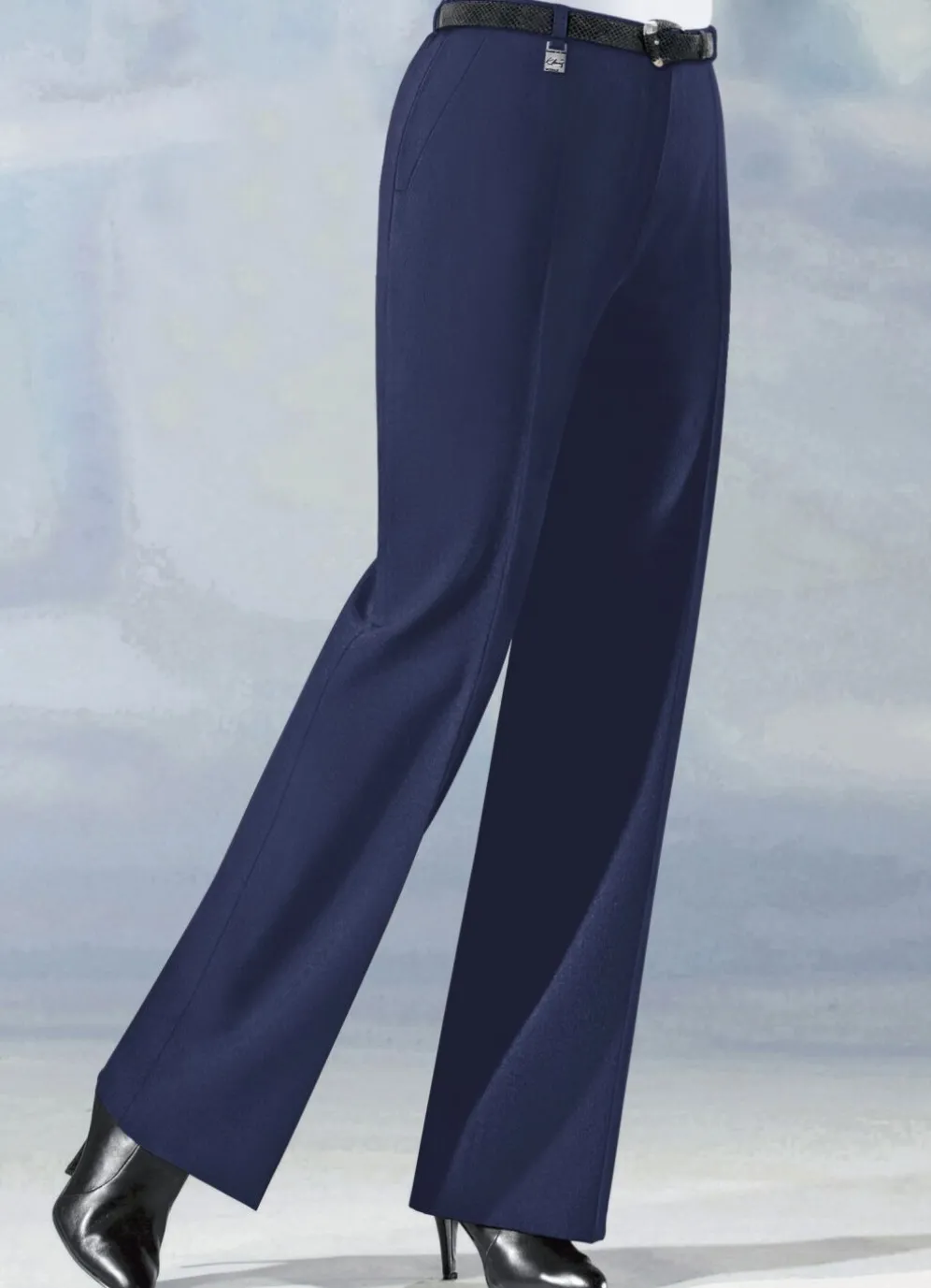 Trendstarke Hose in angesagter Marlene-Form, mit rückwärtigen Dehnbundeinsätze, aparter Zieranhänger an einer der vorderen Gürtelschlaufen, Haken- und Reißverschluss sowie Seitentaschen. Innenbeinlänge ca. 79 cm, Fußweite ab 54 cm.